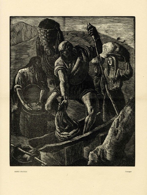 Xilografie. mm 295x250 cad. Foglio: mm 440x323 cad. Entrambe recanti titolo e nome d'artista in lastra lungo il margine inferiore. Timbro a secco de L'Eroica agli angoli superiori dei fogli. Compongono il lotto le opere: Campagna e Il grano.