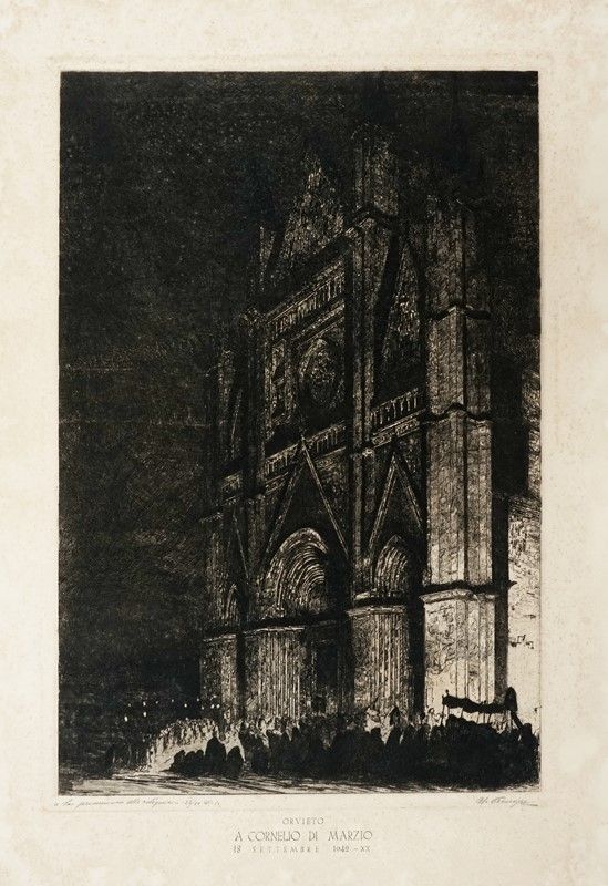 1) La processione delle reliquie. 1942. Acquaforte. mm 550x360. Foglio: mm 700x500. Firmata a matita in basso a destra, titolata a matita in basso a sinistra. Numerata "24/50 VII S." a matita in basso a sinistra dopo il titolo. Dedica manoscritta ad inchiostro di china bruno "Orvieto, a Cornelio Di Marzio 18 Settembre 1942 - XX". 2) Mercato di notte. Acquatinta su carta leggera. mm 280x410. Foglio: mm 350x500. Firmata a matita in basso a destra, titolata a matita in basso a sinistra. Numerata "44/50 III" a matita in basso a sinistra.