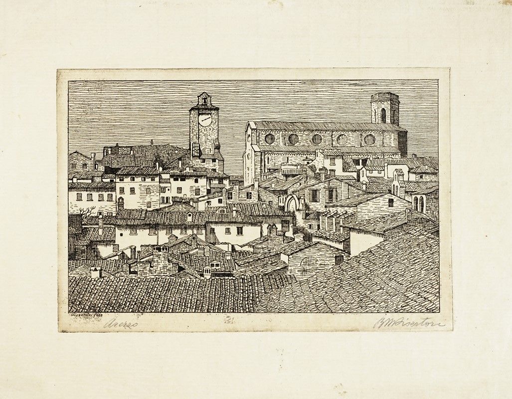 1) Arezzo, la torre civica. Acquaforte su carta vergellata. mm 195x294. Foglio: mm 310x410. BELLINI-ALBERTI, 18. Firmata in lastra con la "s" in controparte in basso a sinistra. Controfirmata a matita in basso a destra. Titolata "Arezzo" a matita in basso a sinistra. Rarissima incisione completa della veduta urbana di Arezzo. Il catalogo Bellini-Alberti menziona l'impressione raffigurante solo la torre come unico stato. Questa acquaforte proviene dal disegno citato nel catalogo Maroni che comprende la stessa veduta più ampia. La collocazione del disegno rimane ignota, mentre la lastra fu probabilmente successivamente divisa. La parte destra, non citata dal catalogo, contiene una veduta laterale del Duomo, anch'esso raffigurato prima delle successive modifiche strutturali. 2) Ronciglione. Acquaforte su carta vergellata con filigrana "Roma" e Lupa. mm 415x320. Foglio: mm 627x470. BELLINI-ALBERTI, 42. Firmata in lastra in basso a destra. Controfirmata a penna a sfera nera in basso a destra e titolata a penna a sfera nera in basso al centro. Incisione in unico stato.