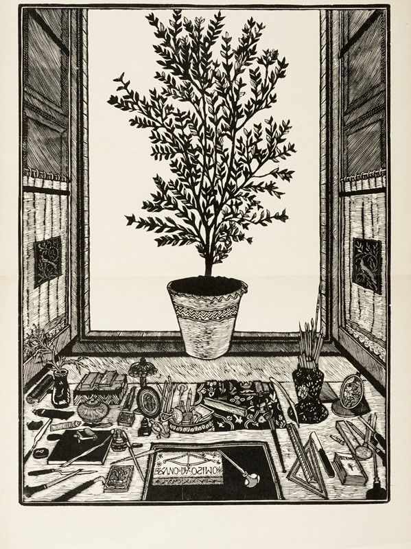 1) Augusta Perugia. 1938. Xilografia su carta vergellata. mm 300x400. Foglio: mm 410x550. Firmata a matita in basso a sinistra, titolata a matita in basso a destra. 2) Il mio tavolo da lavoro. Xilografia su carta filigranata. mm 370x277. Foglio: mm 414x315. Firmato in lastra in basso al centro, all'interno del delizioso dettaglio della lastra in via di creazione circondata dagli strumenti. Datata in lastra in basso al centro. Autore, titolo e piccola descrizione a stampa all'angolo inferiore sinistro del verso.
