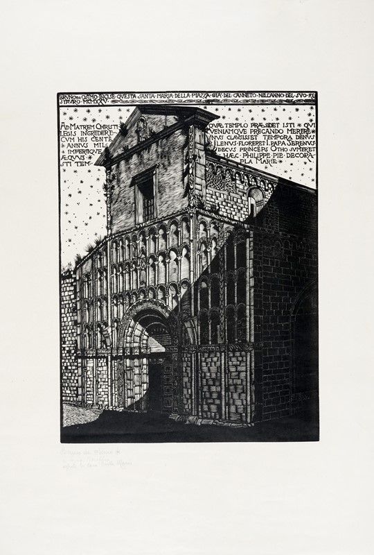 1) S. Maria della Piazza. 1925. Xilografia. mm 382x282. Foglio: mm 485x363. Firmata a matita in basso a sinistra con dedica a Luigi Boroffio. In alto, sul legno: «Bruno da Osimo incise questa Santa Maria della Piazza già del Canneto nell'anno del suo restauro MCMXXV». Al di sotto, sempre sul legno, testo in latino. 2) Plutei nella chiesa di San Ciriaco. 1928. Xilografia a più legni. mm 440x280. Foglio: mm 630x433. Firmata e datata in lastra in basso a sinistra. Dedica a Luigi Boroffio a matita in basso a sinistra. 3) Monumento al tempo. 1950. Xilografia su carta filigranata Fabriano. mm 440x305. Foglio: mm 645x490. Firmato e datato in lastra al margine inferiore. Controfirmato e dedicato a matita in basso a sinistra. Iscrizione "PASSAN - NOSTRI - TRIONFI - E - NOSTRE - POMPE / PASSAN - LE - SIGNORIE - PASSANO - I - REGNI / OGNI - COSA - MORTAL - TEMPO - INTERROMPE". in lastra sul basamento della stele.