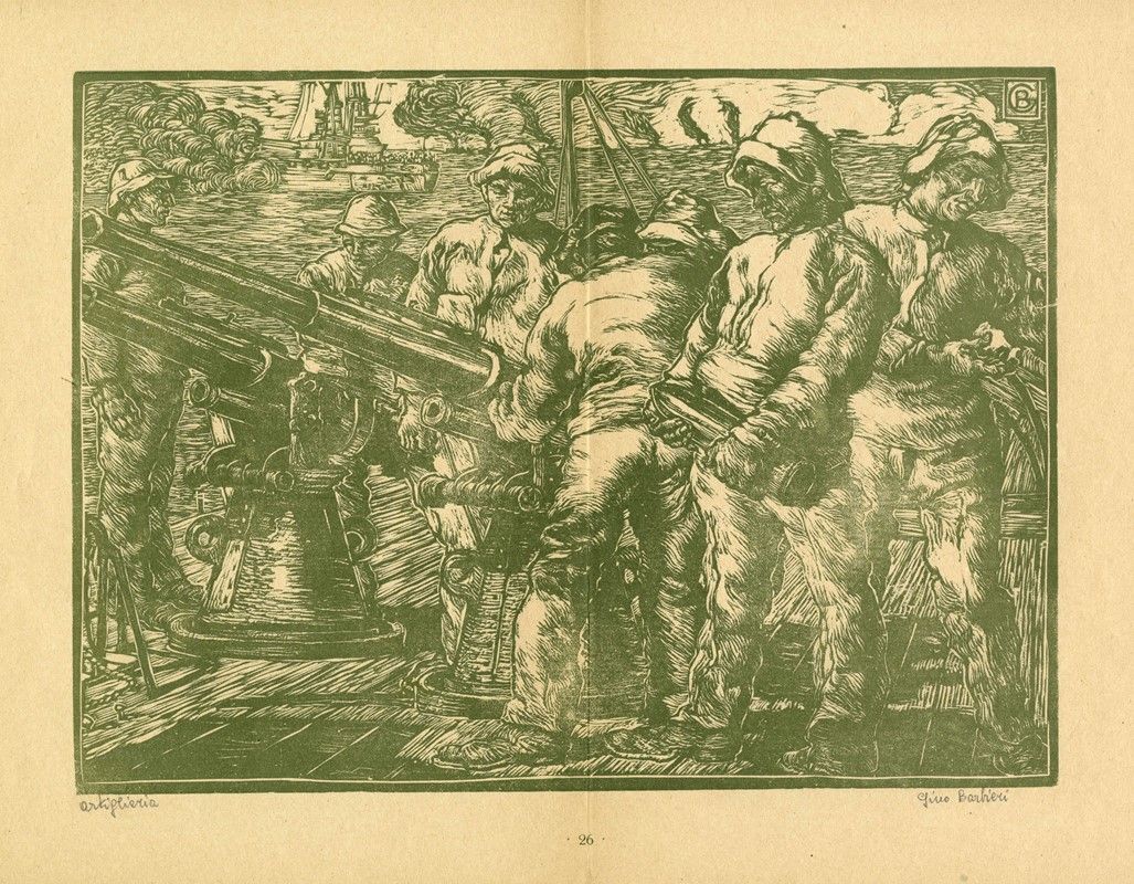 Xilografie. mm 230/315x230/320. Foglio: mm 445x305 (aperto) cad. Tutte monogrammate in lastra agli angoli. Una con iscrizione in lastra "Inciso in trincea". Ogni opera presenta il titolo a matita fuori lastra. Compongono il lotto le opere: Fanti, Artiglieria, Siesta e Soldati, ognuna estratta dalla rivista Xilografia.