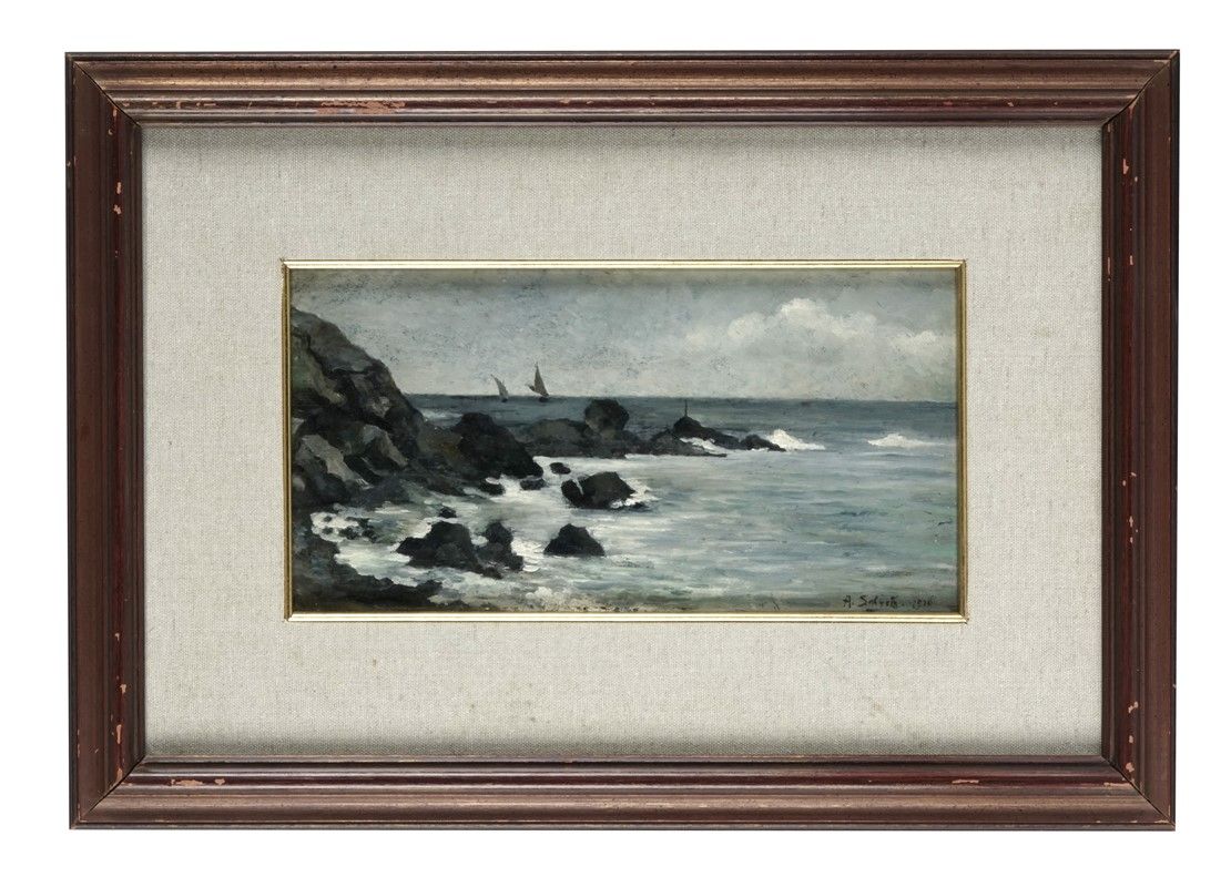 Olio su tavola. cm 16,5x31 (visibile). Firmato e datato in basso a destra.