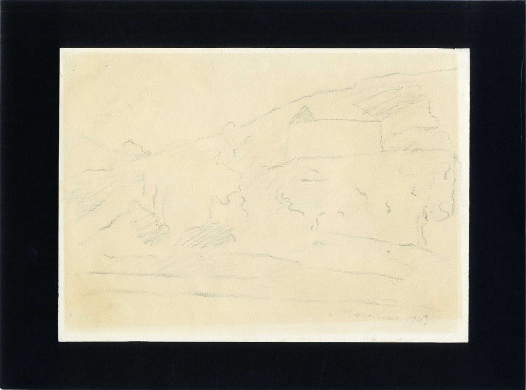 Matita su carta. mm 192x265. Firma e data in basso a destra. Certificato di autenticità su fotografia firmato dalla Prof.ssa Marilena Pasquali. Provenienza: Firenze, S. Fortunati; Bologna, Galleria Transart Tolentino; Galleria Giraldi Roma; Collezione privata romana. Bibliografia: E. Tavoni, Morandi, Disegni Catalogo Generale, Electa Milano 1994, pag. 80 n. 1943-20.
