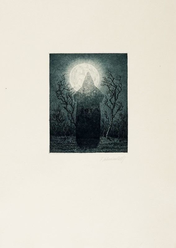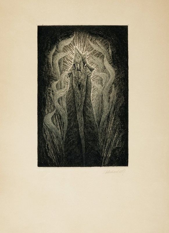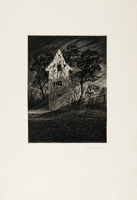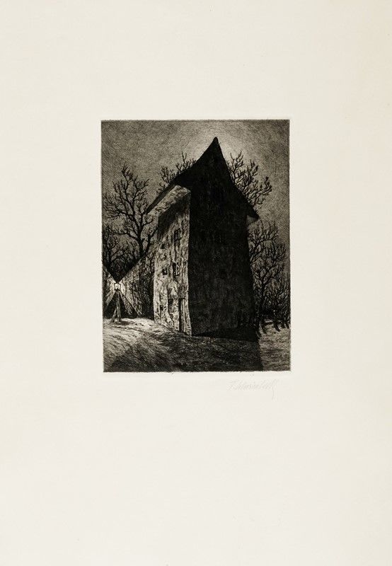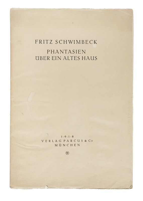 Rara e completa cartella di 8 acqueforti con introduzione di Hans Ludwig Held e frontespizio calligrafico a stampa firmato dall'artista. mm 135/240x95/155. Fogli: mm 450x320 cad. Ogni plancia presenta la firma d'artista a matita in basso a destra. Dati editoriali riportati al piatto anteriore ed indicazione di tiratura a stampa al piatto posteriore. La prima edizione di 25 esemplari fu stampata su carta Giappone, mentre questa seconda edizione di 125 copie totali venne realizzata a Monaco su carta di gelso al finire della Prima Guerra Mondiale. In questa pubblicazione Schwimbeck gioca sul tema della spettralità, riprendendo l'immaginario della casa infestata ed abbandonata. Le tavole contenute, in ordine, sono: Verlassene Muhle (Il mulino abbandonato), Im Herbststurm (La torre d'autunno), Schatzgraber (Cacciatore di tesoro), Auflosung (Risoluzione), Traum (Sogno), Fieber (Febbre), Damon (Demone) e In Schnee (Nella neve). Edizione mancante di indicazione di tiratura.