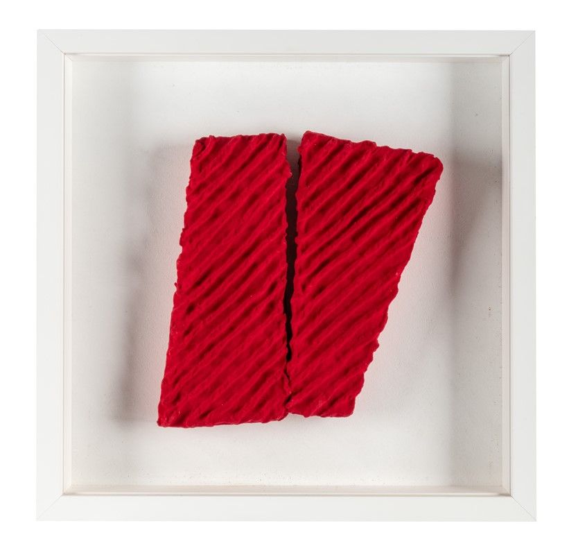 Due elementi a tecnica mista ricoperti di velluto dipinto. cm 32x13 circa cad. Totale: cm 32x28. L'intero supporto è di cm 50x50. Opera accompagnata dal certificato di autenticità su fotografia. I dati dell'opera sono riportati sia al verso dell'opera a pennarello nero che sul supporto posteriore della cornice a pennarello rosso. L'artista si concentra sullo studio del frammento, sul quale la materia respira, prende vita; il frammento diventa, così, un corpo inquieto che investiga e conosce lo spazio, lo sperimenta, lo attraversa, disseminandosi in esso e provocando a livello tattile lo spettatore.