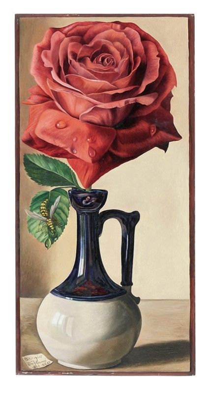 Olio su tavoletta. cm 29x14. Firmato e datato in basso a sinistra nel fazzoletto di carta vicino ai piedi del contenitore.