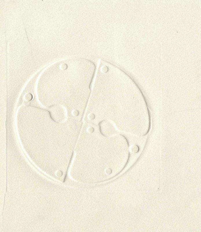 Impressione a secco e pastello rosso su carta Fabriano. mm 195x335, ma il foglio è naturalmente piegato a metà. Firma e tiratura a matita in basso ai lati. Dettagli a pastello rosso. Es. 194/300.
