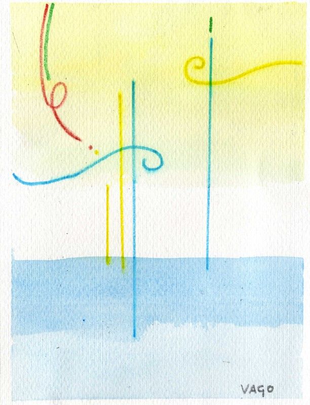 Acquerello, pastello e pennarello su cartoncino. mm 196x151. Firma a matita in basso a destra. Al verso doppio timbro a inchiostro nero de "Mail Art - Archivio Eraldo Di Vita", iscritto l'indirizzo del critico d'arte e "Grazie", con controfirma dell'artista. Targhetta applicata con i dati dell'opera e francobollo "Castello Aragonese, Ischia, Italia" con timbro.