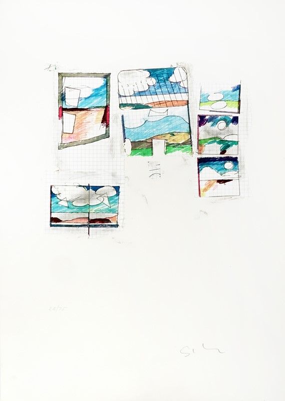 Litografia e collage su carta. mm 850x600. Firmata a matita in basso a destra e numerata in basso a sinistra. Es. 28/75.
