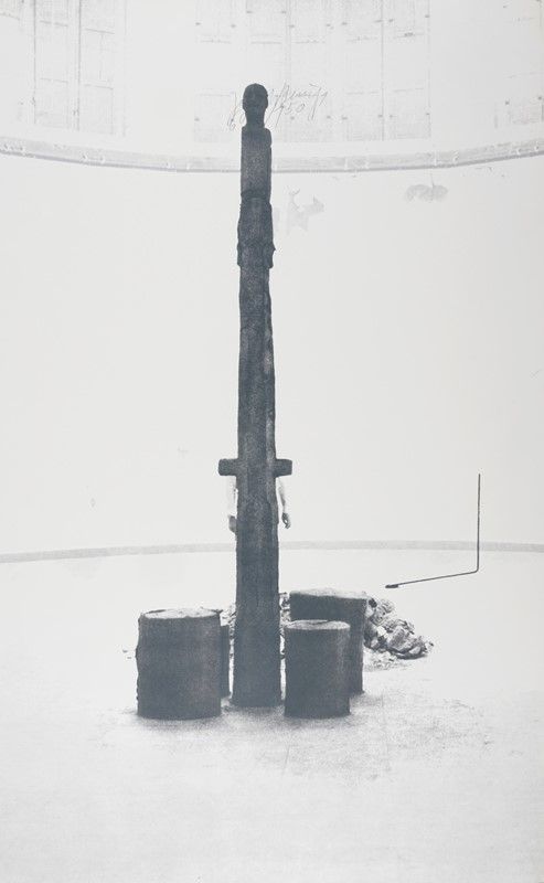 Offset da serigrafia. mm 990x630. Firmata e numerata a matita in alto al centro. Es. 60/150. Al verso, "photo by Bubi Durini" ed "Edizione Galleria Lucrezia De Domizio". Il rapporto tra Joseph Beuys e Lucrezia De Domizio nasce nel 1971; entrambi convinti che l'arte e la vita si sovrappongano e intreccino senza possibilità di delimitare i confini dell'una e dell'altra, affermano che l'arte sia, appunto, l'unica possibilità per esistere.