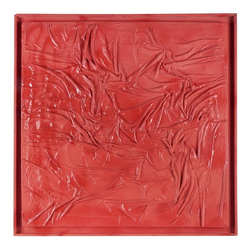 Olio rosso, tessuto e vernice spray metallizzata viola su tela. cm 85,5x87. Firma dell'artista a pennarello nero al verso. Opera accompagnata dal certificato di autenticità su fotografia dell'Archivio Carmassi.