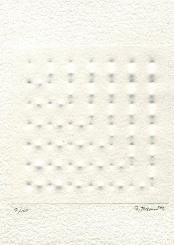 Estroflessione su carta Colombe Larroque da 400g. mm 190x190. Foglio: mm 300x220. Firma e data a matita in basso a destra e tiratura in basso a sinistra. Opera stampata da Fabrizio Barbi per Colophon 10, Gennaio 2002, in tiratura di 100+XV copie numerate e firmate a matita dall'artista. Il volume si vende insieme all'opera e comprende una xilografia di Adriano Porazzi. Es. 19/100.