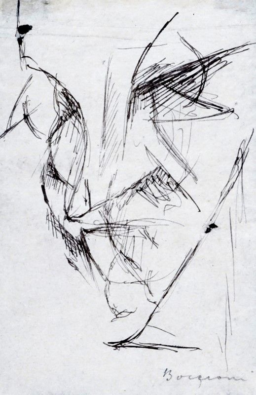 Penna e inchiostro di china su velina greve. mm 136x87. Firma a matita in basso a destra. Al passe-partout targhetta della Civica Galleria d'Arte Moderna con i dati dell'opera a pennello e inchiostro di china, la data dell'arrivo dell'opera in Galleria (1933), il numero di catalogo (n.70) e la citazione della signora Betty Baer per la provenienza. Betty Baer è stata grande amica dell'artista e una delle opere più celebri di Boccioni raffigura proprio lei con la figlia Nora (Ritratto di Betty e Nora Baer, 1909). Provenienza: importante collezione fiorentina.