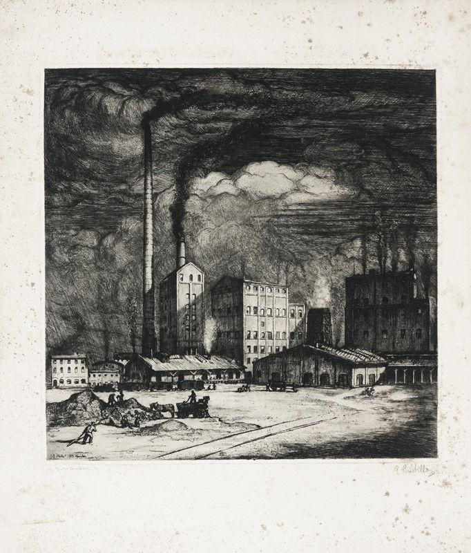 Acquaforte. mm 440x440. Foglio: mm 640x560. Firmata e datata in lastra in basso a sinistra. Controfirmata a matita in basso a destra. Titolata a matita in basso a sinistra. Ulteriori appunti a matita all'angolo inferiore destro del foglio.