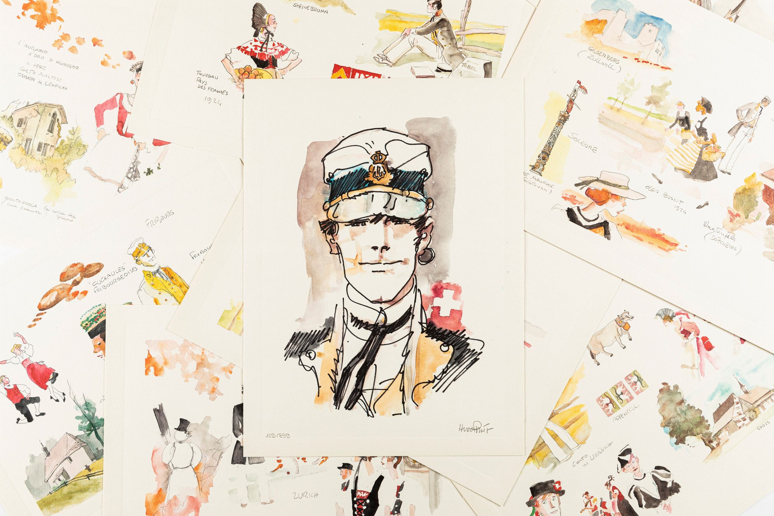 litografia su cartoncino, 30 x 40 ciascuno 1991 Portfolio '...et in Helvetia Corto' contenente 25 litografie a colori impresse su cartoncino di pregio Fabriano, edito dalla Cong SA nel 1991. Opera realizzata in occasione dei festeggiamenti per i 700 anni della Confederazione Elvetica, tirato in 899 esemplari in cifre arabe + 100 editi in cifra romana. Il nostro esemplare, edizione in tela rossa, fa parte della tiratura in cifre arabe (copia 129/899), ha la particolarità di avere la prima litografia (con il ritratto di Corto Maltese) numerata e firmata a matita personalmente da Pratt. Litografie e custodia originale in perfette condizioni.