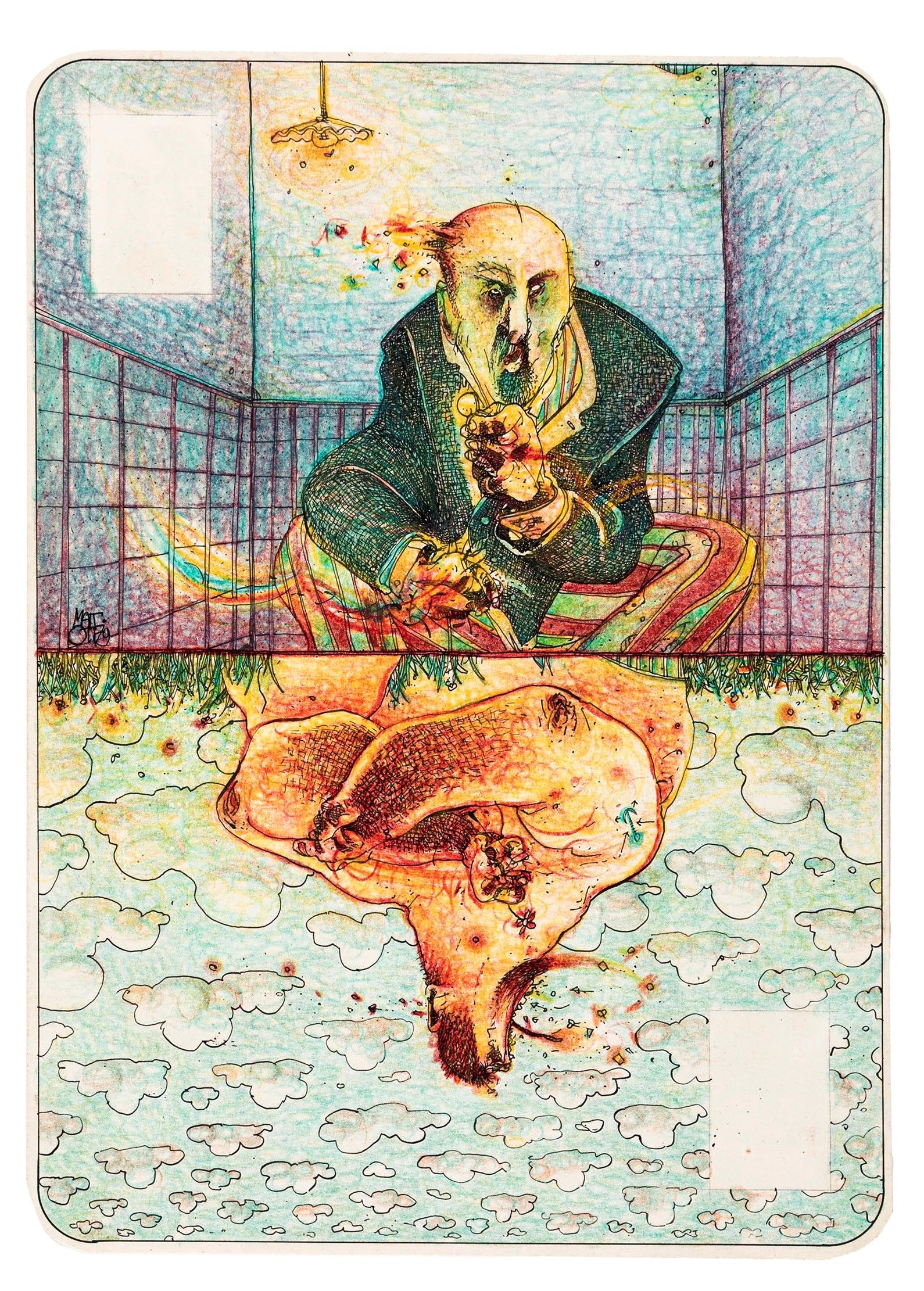 china e pastelli su cartone, 19,5 x 27 cm 1979 Illustrazione originale realizzata da Mattotti per la carta del 6 di Quadri contenuta nel mazzo da gioco Le Nuvole Parlanti edito nel 1980. Leggendario mazzo da gioco a cui parteciparono 120 autori tra i più celebri dell‘epoca. Firmata e datata.