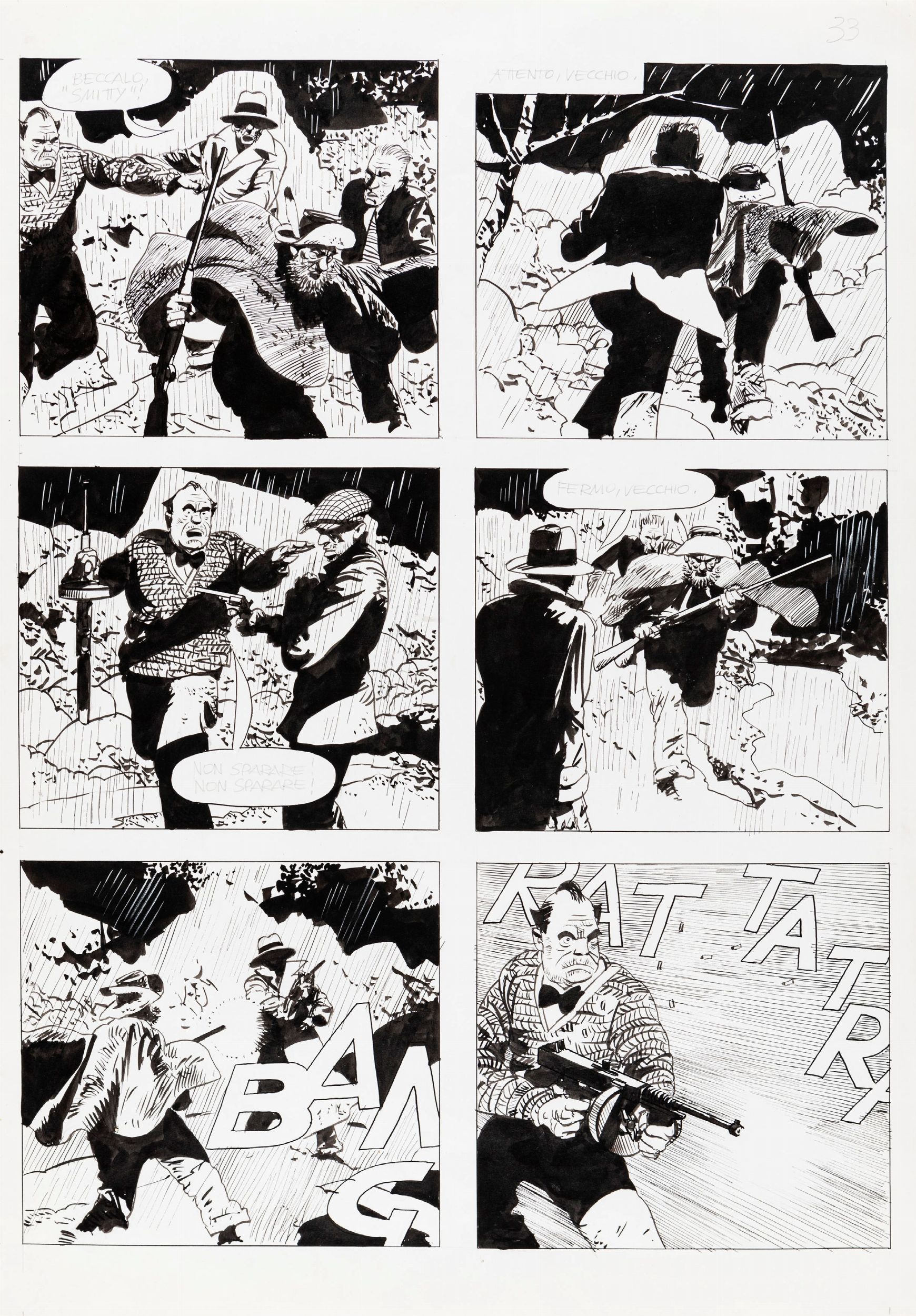 matita e china su cartoncino, 35 x 50 cm 1983 Tavola originale realizzata da Micheluzzi per 'La bionda e il pilota', primo episodio di Air Mail pubblicato per la prima volta sulle pagine della rivista Orient Express n. 13 nel 1983. Lieve piega all'angolo superiore destro.