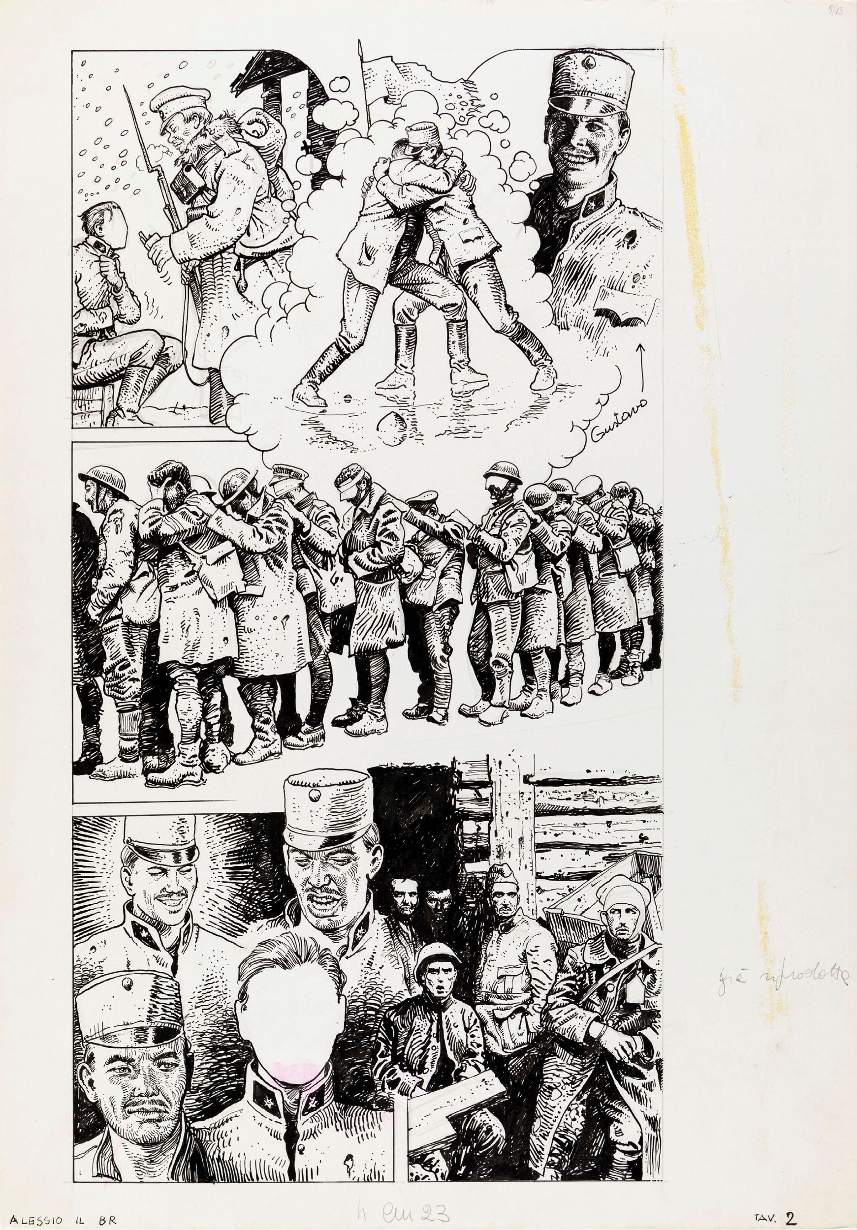 matita e china su cartoncino, 35,5 x 50 cm 1977 Tavola originale realizzata da Manara per 'Alessio il Borghese rivoluzionario', edita a pag. 2 per la prima volta sulla rivista AlterAlter nel 1977 sui testi di Silverio Pisu. Un‘opera dai connotati fortemente politici e tecnicamente tra i migliori lavori di Manara.