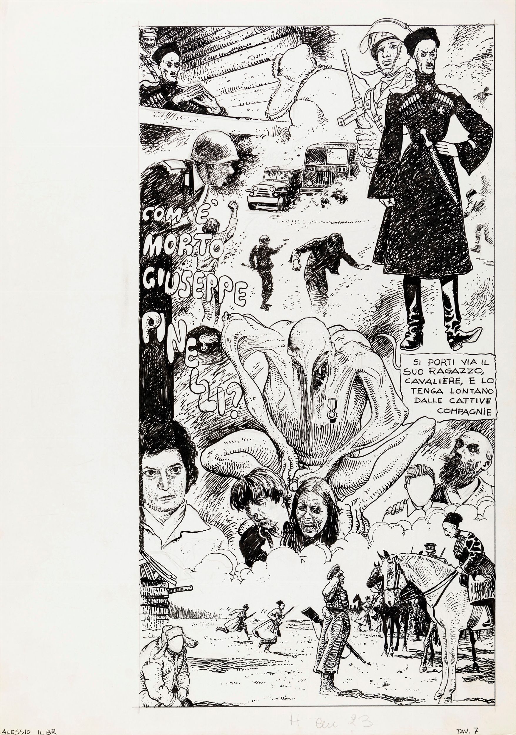 matita e china su cartoncino, 35,5 x 50 cm 1977 Tavola originale realizzata da Manara per 'Alessio il Borghese rivoluzionario', edita a pag. 7 per la prima volta sulla rivista AlterAlter nel 1977 sui testi di Silverio Pisu. Un‘opera dai connotati fortemente politici e tecnicamente tra i migliori lavori di Manara.