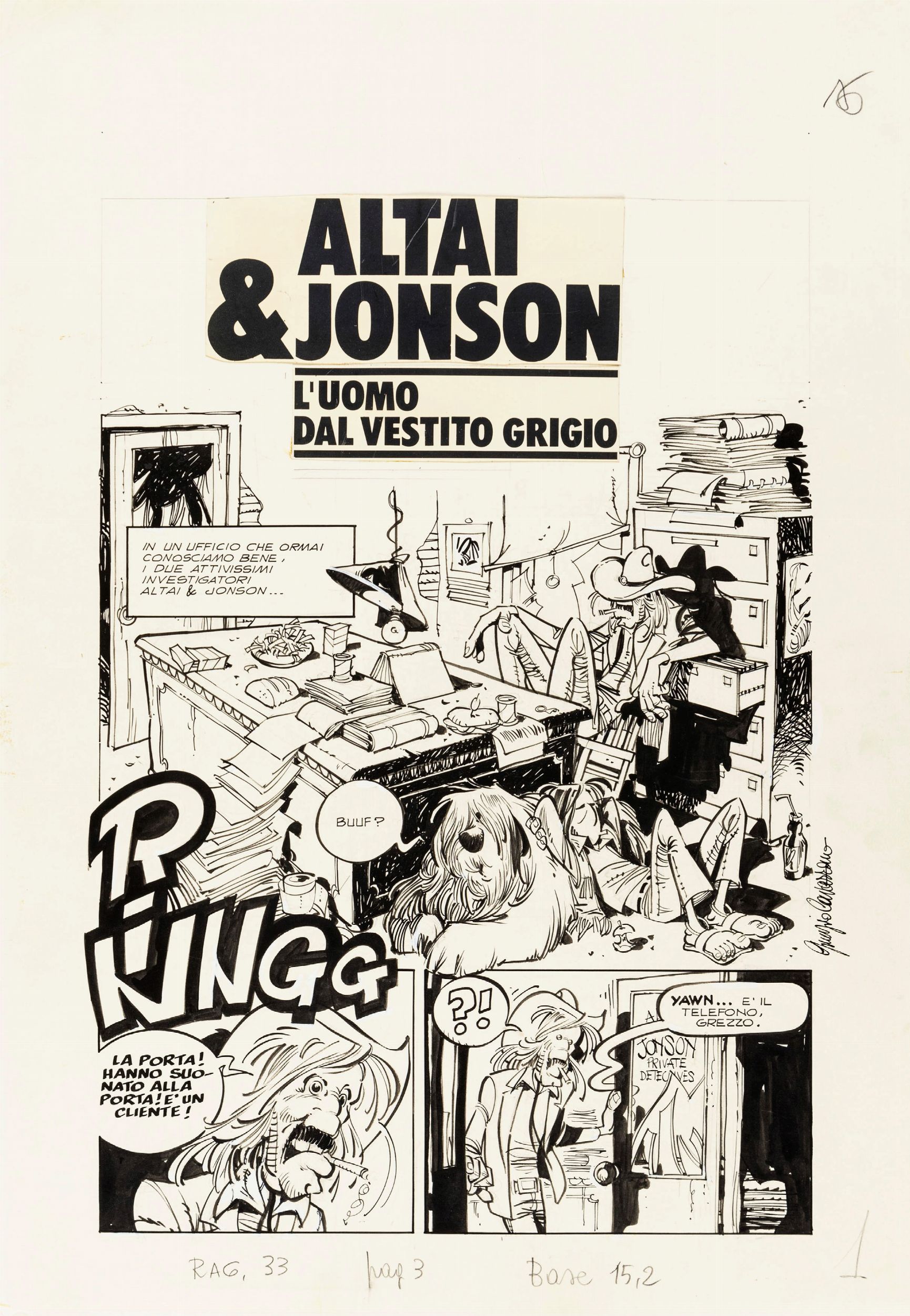 matita e china su cartoncino, 35 x 50 cm 1976 Title page originale realizzata da Cavazzano per 'L'uomo dal vestito grigio', settimo episodio della mitica serie Altai & Jonson pubblicato sul CdR n. 33 nel 1976. Un particolare della prima vignetta fu utilizzata come copertina. Nati nel 1975 dal fervido genio di Tiziano Sclavi e dal magistrale pennello di Giorgio Cavazzano, Altai & Jonson sono la parodia dei vari Starsky e Hutch dei film e telefilm polizieschi americani che spopolavano negli anni '70, diventando presto un titolo di culto tra gli amanti del genere. Firmata.
