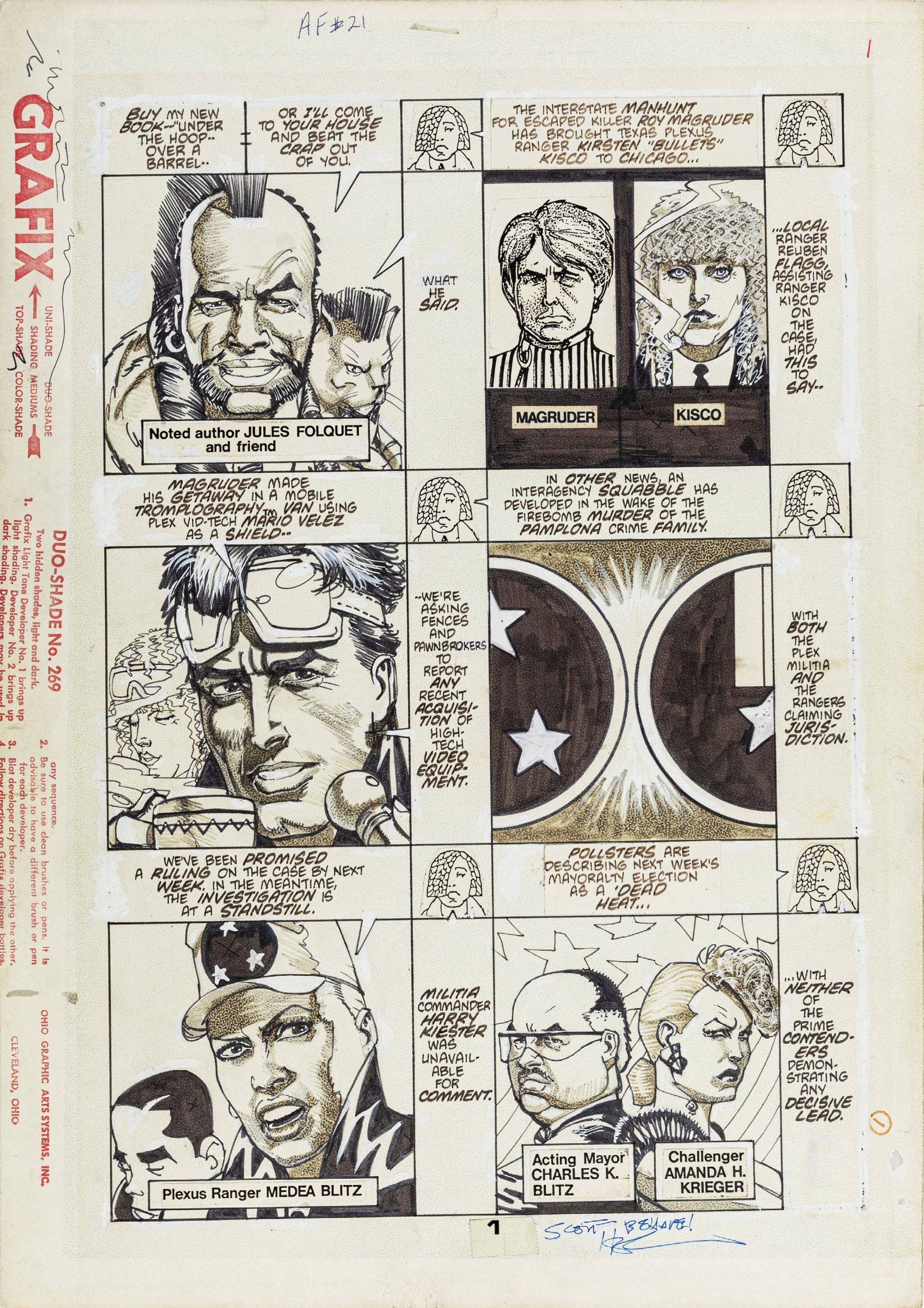 1985 Tavola originale realizzata da Chaykin per 'Red Tape & Blackmail!!', edita su American Flagg! n. 21 a pag. 1 dalla First Comics nel 1985. Piccola ammaccatura al margine destro. Firmata.