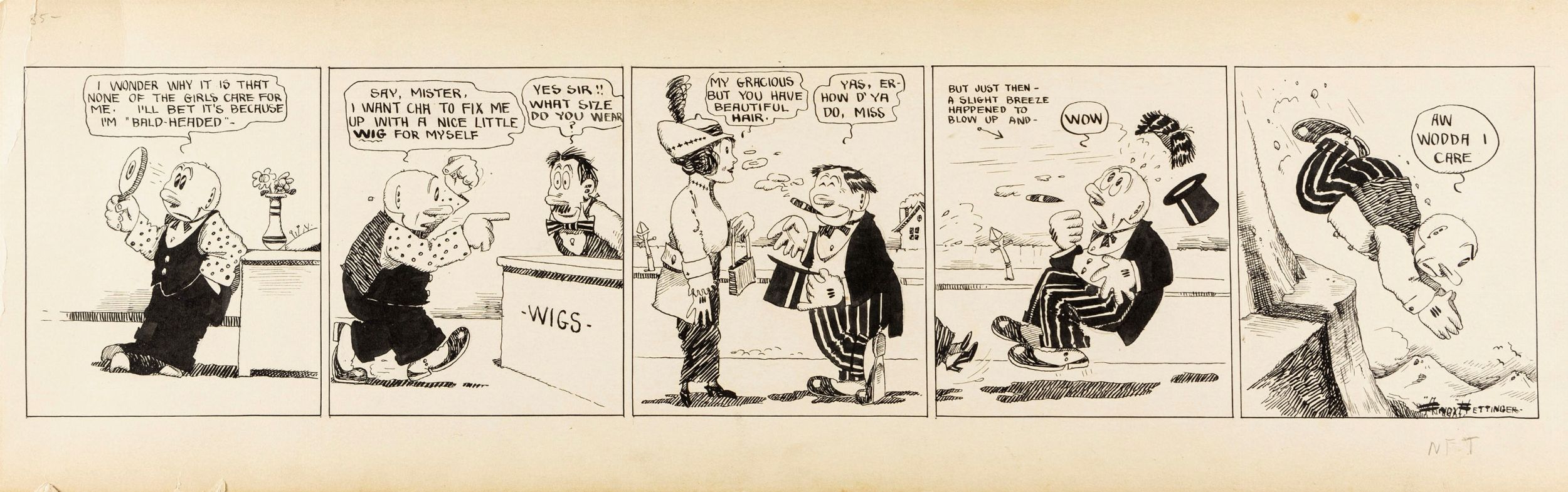 anni 10 Striscia giornaliera degli anni '10 per 'Amos Roach'. Lievi pieghe all'angolo superiore sinistro e due piccoli strappi al margine inferiore. Firmata.