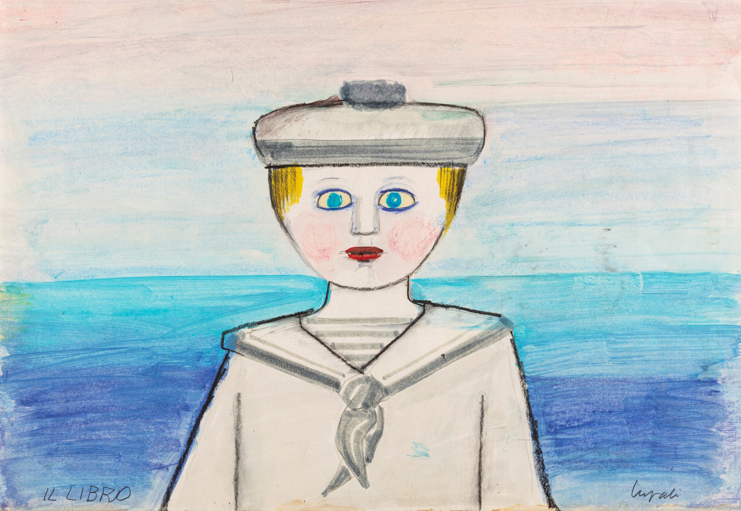1983 Illustrazione originale realizzata da Luzzati per il video clip del brano musicale 'Il Libro' di Angelo Branduardi, traccia dell'album 'Cercando l'oro' del 1983. Luzzati è tra i più importanti scenografi e illustratori della seconda metà del ‘900, interprete di una cultura figurativa abile e colta, capace di usare con maestria ogni sorta di materiale: dalla terracotta ai collage di carte e tessuti composti per costruire bozzetti di scene, di costumi, di allestimenti teatrali. La ricchezza del suo mondo fantastico, l‘immediatezza ed espressività del suo stile personalissimo, ne hanno fatto uno degli artisti più amati e ammirati del nostro tempo. «Di fronte alle sue scenografie si ha quasi sempre l‘impressione di finire mani, piedi e pensieri dentro un sogno. » Firmata e titolata.