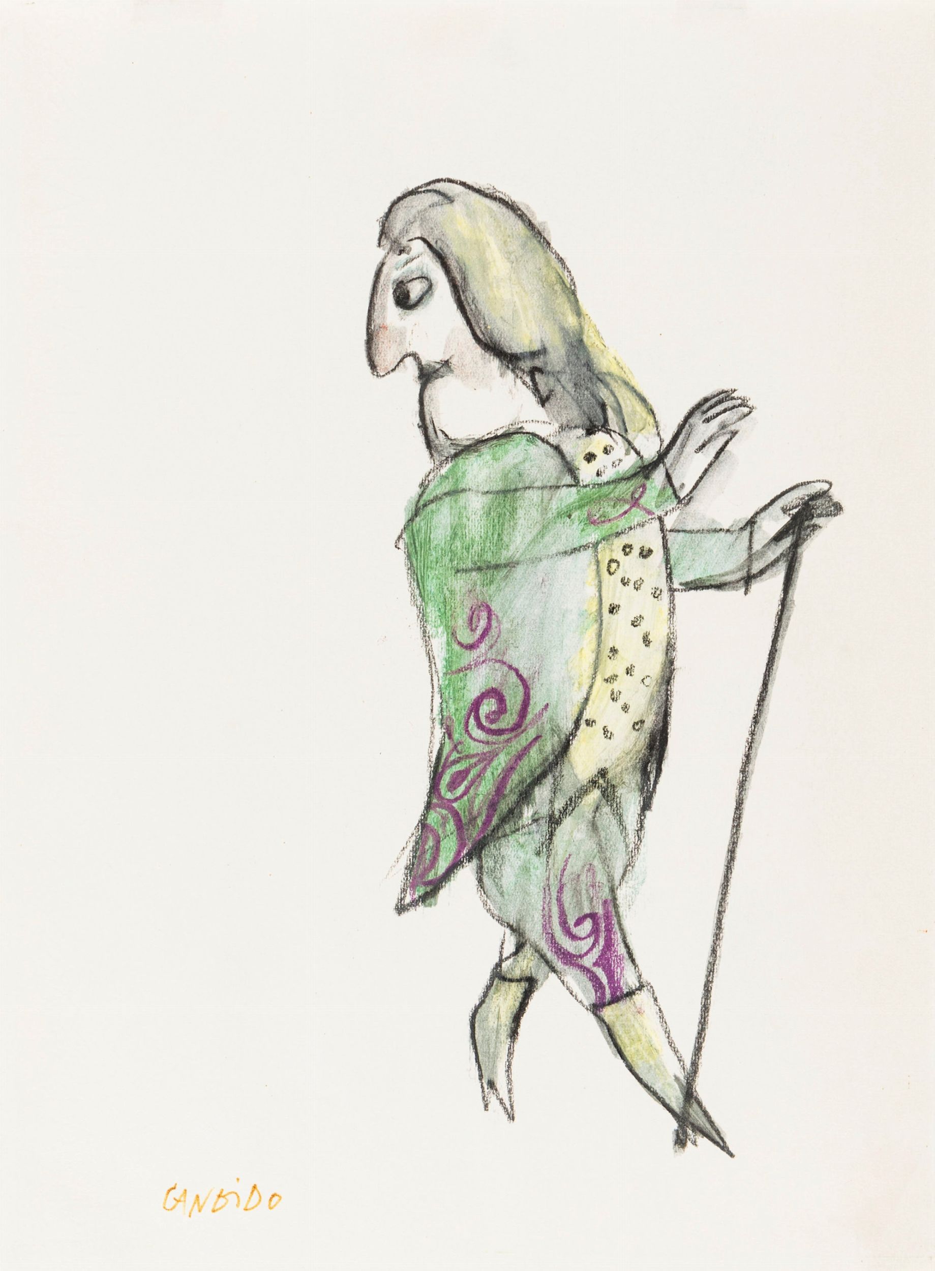 carboncino, pastelli a cera e acquerello su cartoncino, 24 x 32 cm 1994 Figurino teatrale realizzato da Luzzati per la rappresentazione teatrale dell'operetta comica in due atti 'Candide' di Leonard Bernstein, basata sulla omonima novella di Voltaire, andata in scena al Teatro dell'Opera di Saint Louis nel 1994. Titolato.