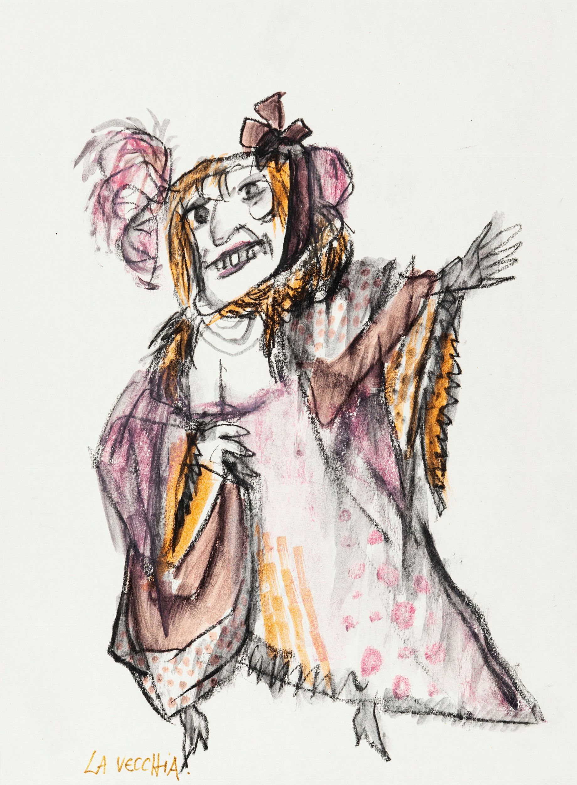 carboncino, pastelli a cera e acquerello su cartoncino, 24 x 32 cm 1994 Figurino teatrale realizzato da Luzzati per la rappresentazione teatrale dell'operetta comica in due atti 'Candide' di Leonard Bernstein, basata sulla omonima novella di Voltaire, andata in scena al Teatro dell'Opera di Saint Louis nel 1994. Titolato.