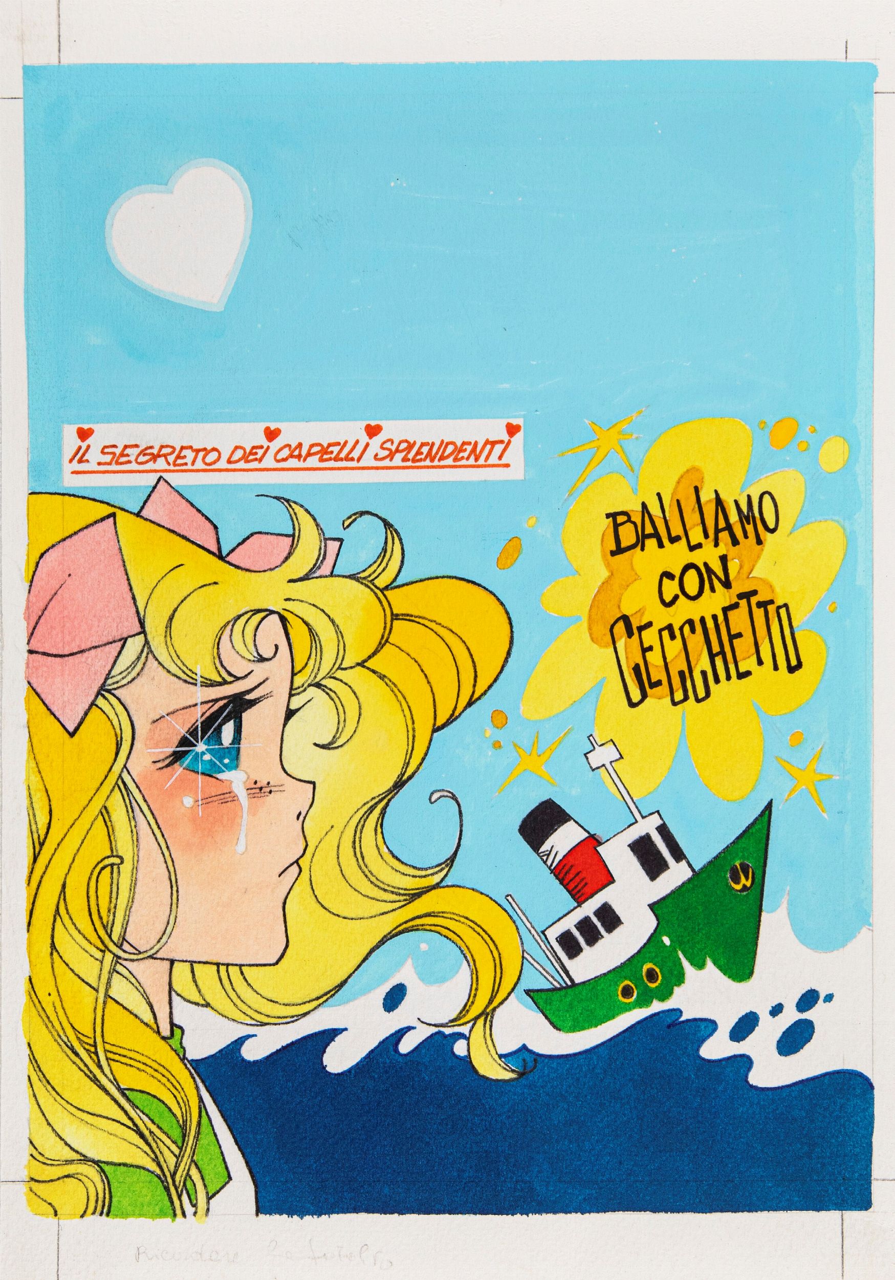 pastelli, acquerello e tempera su cartoncino, 19,5 x 28 cm 1981 Originale di copertina realizzato da Frigerio per Candy Candy n. 32, edito dalla Fabbri Editore nel 1981. Personaggio creato dalle due autrici giapponesi Kyoko Mizuki (testi) e Yumiko Igarashi (disegni) Candy Candy nacque come manga nel 1975 e nel 1976 come anime di 115 episodi, la Fabbri Editore fu la prima a portare in Italia la versione a colori (censurata) del fumetto originale raccolta in 77 numeri.