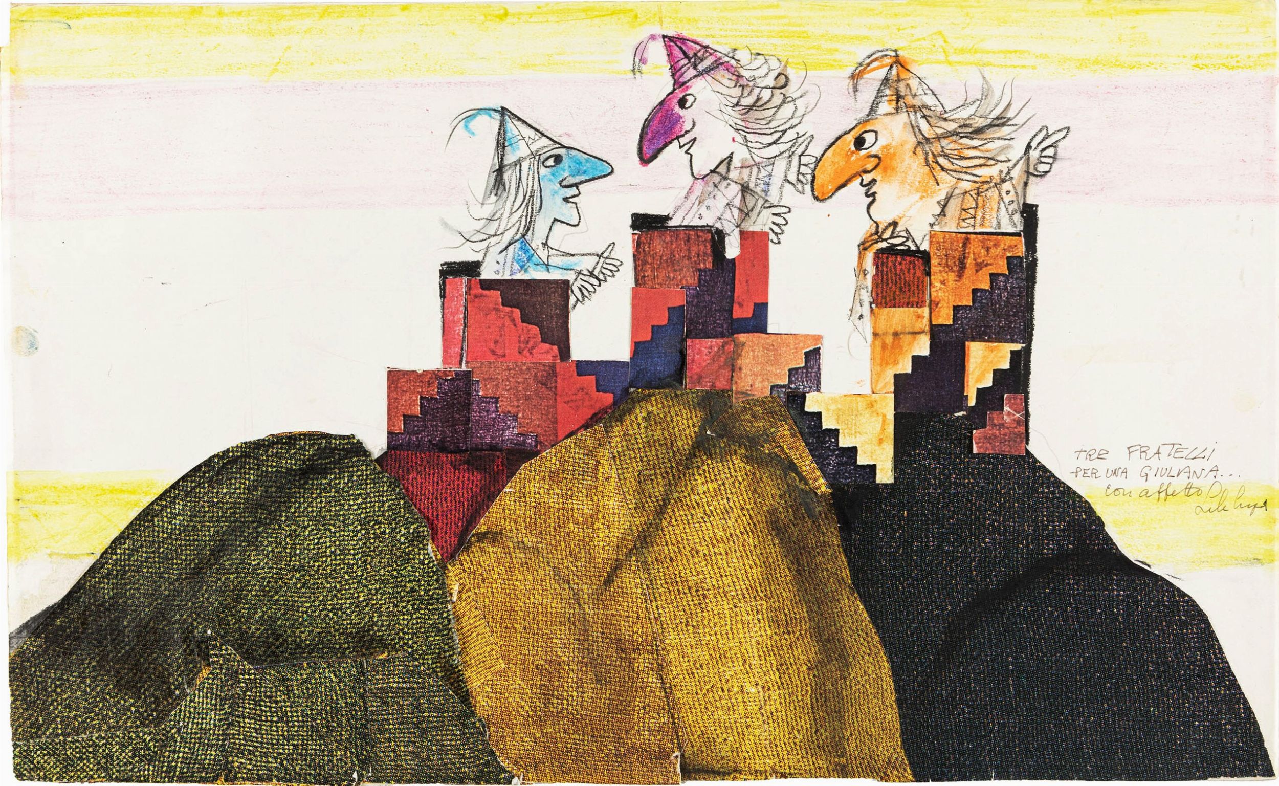 matita, carboncino, acquerello e collage su cartoncino, 46,5 x 28,5 cm 1977 Illustrazione originale realizzata da Luzzati per la fiaba 'C'erano tre fratelli', edita dalla Emme Edizioni nel 1977. > Al retro è presente l'etichetta editoriale. Firmata e dedicata.
