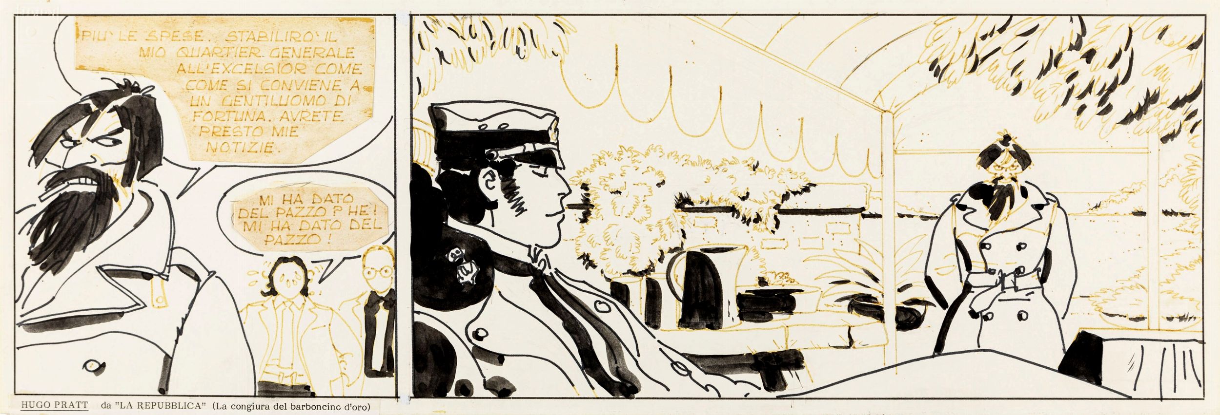 matita e china su cartoncino, 48 x 16,5 cm 1982 Striscia originale realizzata da Pratt per 'Corto Maltese: Sogno di una Biennale di fine estate', avventura di Corto sceneggiata da Alberto Ongaro e pubblicata a puntate dal 28 Agosto al 10 Settembre del 1982 sul quotidiano La Repubblica in occasione della 39ma Biennale del Cinema di Venezia. La storia fu successivamente ristampata con il titolo 'La congiura del barboncino d'oro' sulla rivista Comic Art n. 4 nel 1984. Corto Maltese e Rasputin si trovano nella Venezia del 1982, dove il russo riceve l’incarico di sabotare il festival da alcuni uomini politici senza volto. Dai tratti spiccatamente ironici, questa avventura (chiaro omaggio al mondo del cinema) rappresenta un divertissement, praticamente un sogno di Corto Maltese; un Pratt in stato di grazia ci regala alcuni ritratti del suo Corto tra i più ispirati della sua carriera.