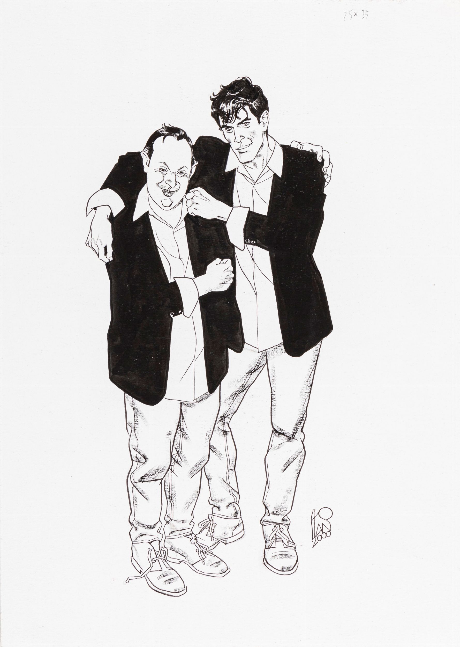 2000 Illustrazione originale realizzata da Stano raffigurante Dylan Dog, l'indagatore dell'incubo, e il suo creatore Tiziano Sclavi. Firmata e datata.