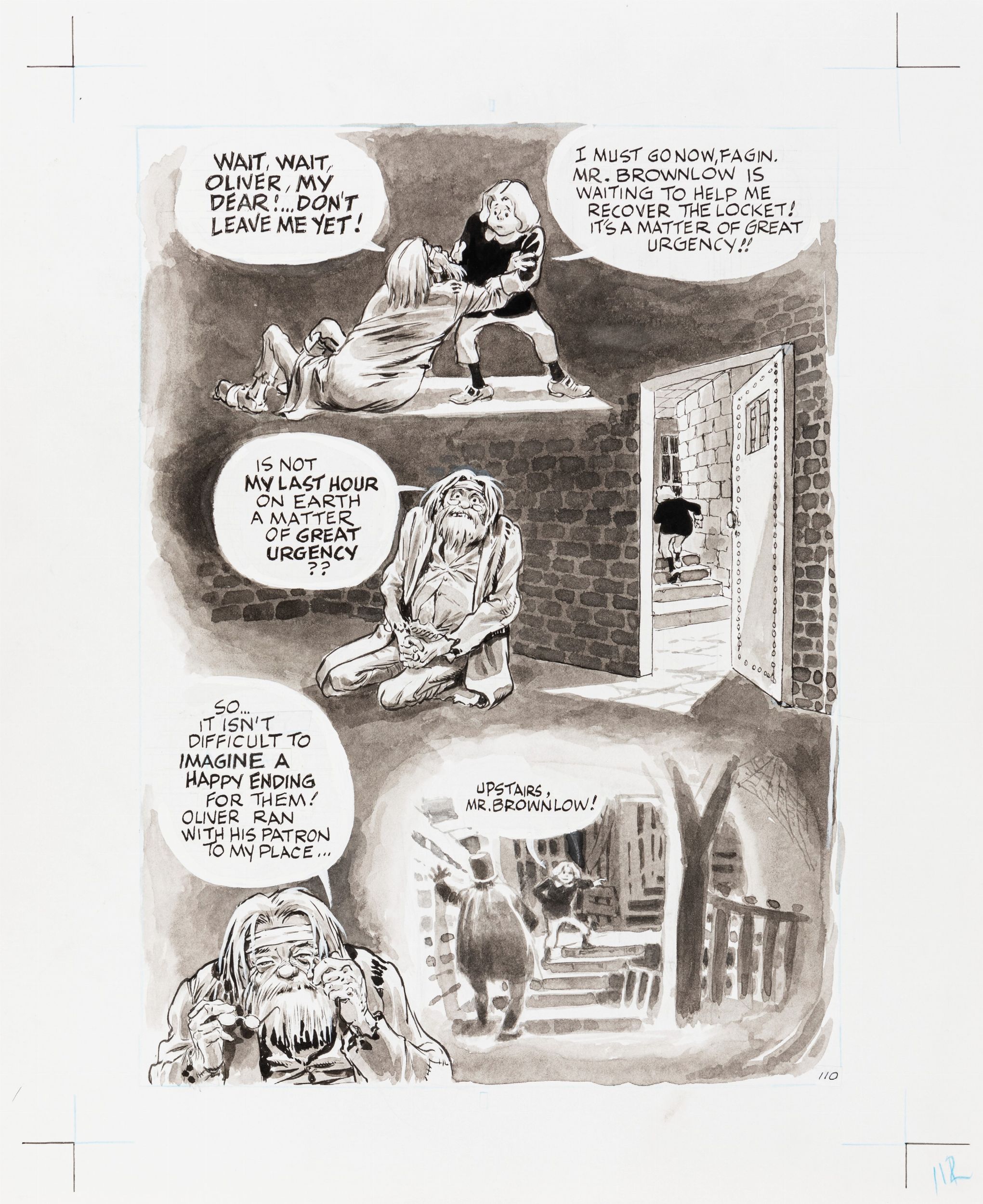 2003 Tavola originale realizzata da Eisner per 'Fagin l'ebreo', pag. 110 di questo struggente racconto edito per la prima volta negli USA dall'editore Doubleday nel 2003. Rileggendo Oliver Twist dal punto di vista di Fagin, Will Eisner ci fa conoscere sotto nuova luce e con inedita profondità uno dei personaggi più malfamati della storia della letteratura. Eisner dimostra ancora una volta di essere non soltanto un maestro nell'arte del racconto a fumetti, ma anche un acuto critico letterario e un attento osservatore della società. Eisner raffigura il malvagio Fagin come un individuo complesso e tormentato, e attraverso la sua storia rappresenta la vita della comunità ashkenazita nella Londra dell'Ottocento: uno sguardo provocatorio sulla povertà, il pregiudizio e l'antisemitismo dell'epoca, una memorabile riflessione storica, una narrazione per immagini di rara forza evocativa. Al retro il timbro dell'autore.