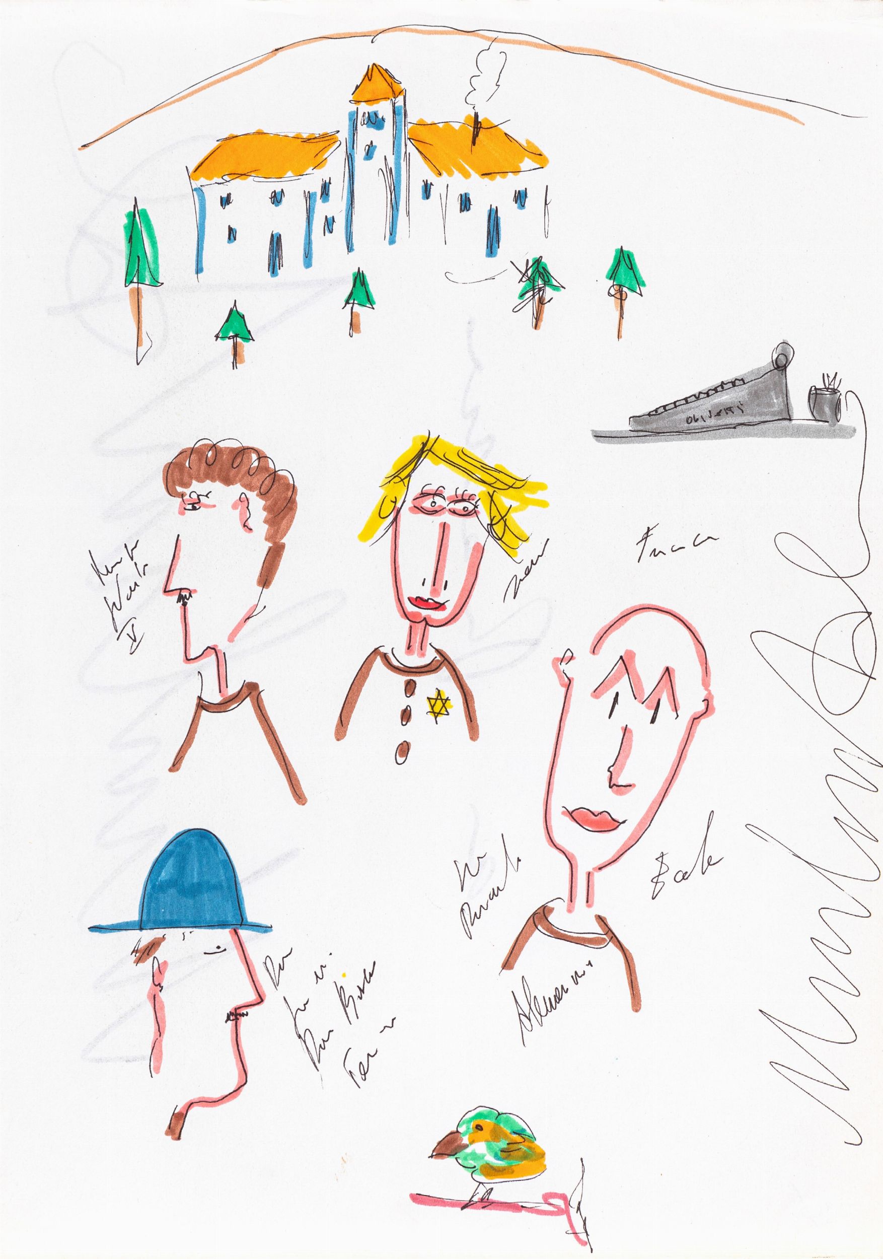 anni 90 Disegno originale realizzato da Eco alla fine degli anni '90 in occasione della sua partecipazione come giurato al premio letterario di Grinzane Cavour. Firmato al fronte e al retro.