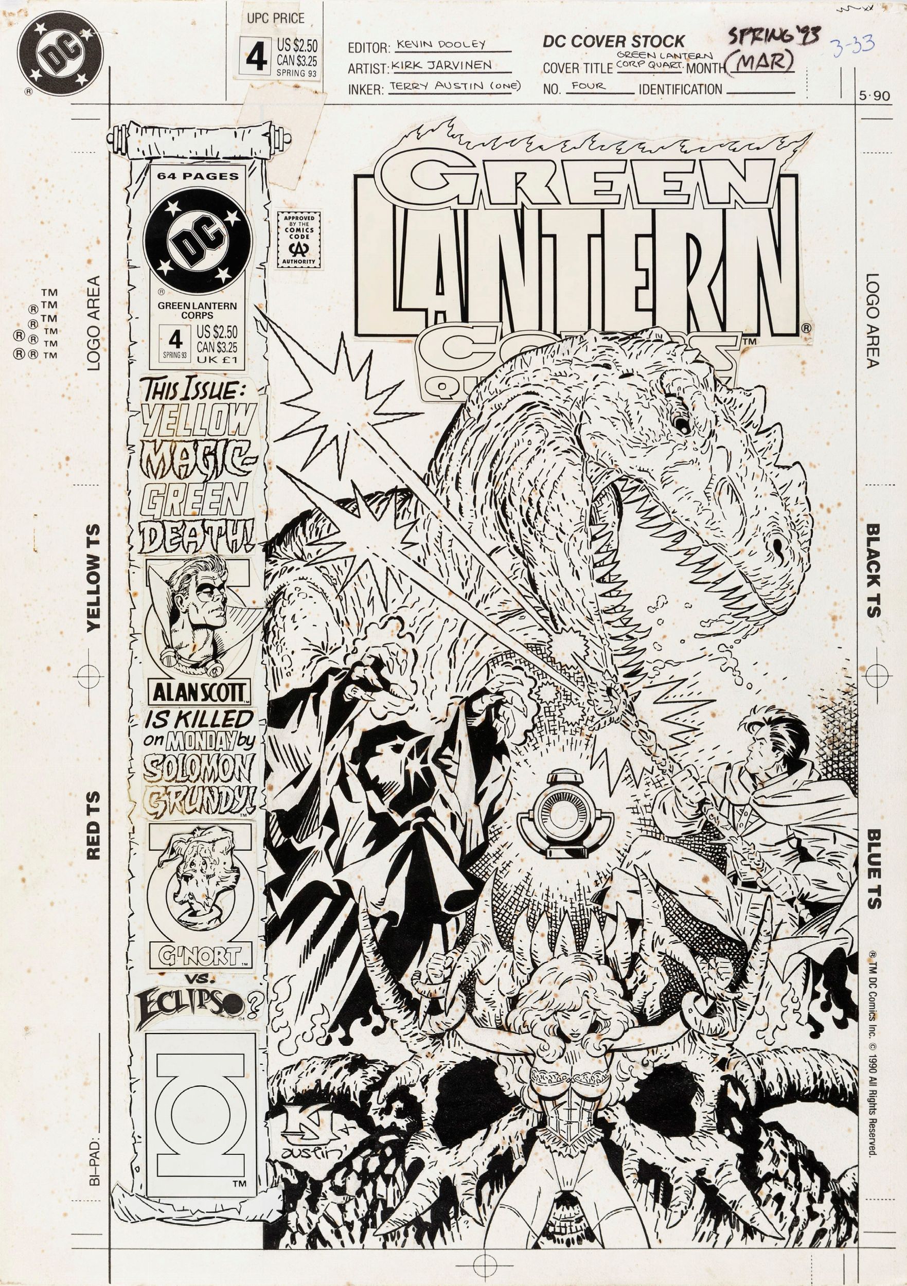 matita e china su cartoncino DC, 30,5 x 43 cm 1993 Originale di copertina realizzato da Kirk Jarvinen e Terry Austin per 'Green Lantern Corps Quarterly' n. 4, edito dalla DC nel 1993. Tracce di foxing, fori di affissione ai margini, piccola mancanza all'angolo superiore sinistro e lieve piega. Firmato da entrambi gli autori.