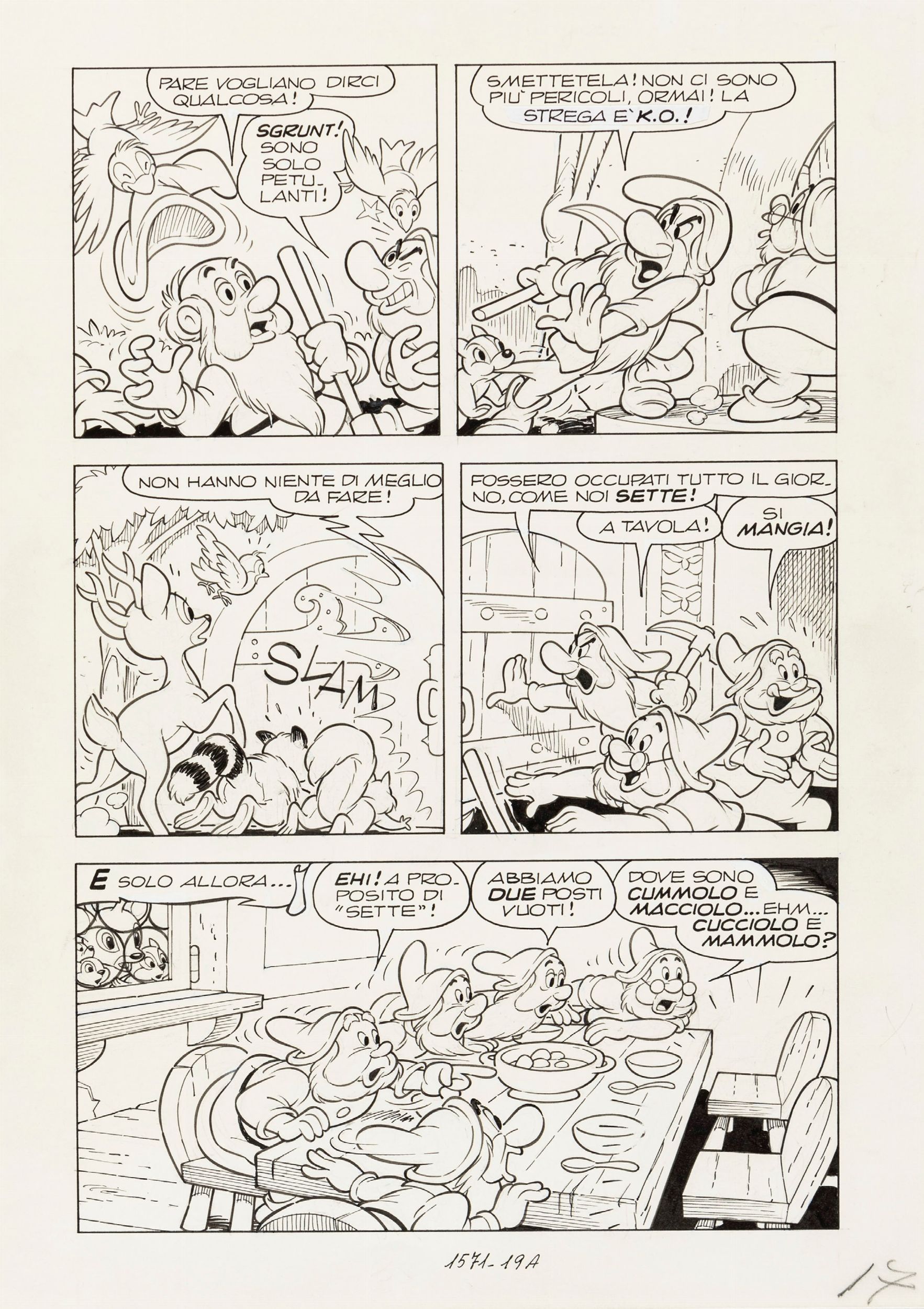 matita e china su cartoncino, 25 x 35 cm 1986 Tavola originale realizzata da Scarpa per 'I 7 Nani e il cristallo di Re Arbor' edita su Topolino n. 1571 a pag. 17 nel Gennaio 1986. Questa storia, realizzata interamente da Scarpa, si può considerare il seguito del lungometraggio 'Biancaneve e i sette nani', e ci mostra in che modo la regina cattiva Grimilde si salvò dalla caduta nel precipizio per poi tornare all'attacco.