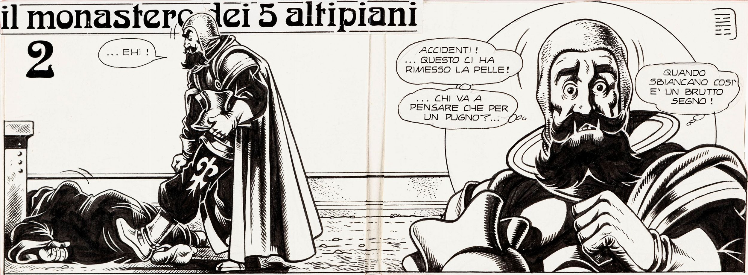 matita e china su cartoncino, 30,5 x 11 cm 1978 Vignetta originale realizzata da Magnus per 'Ombre del palazzo' contenuta nell'Atto I de I Briganti a pag. 15 e pubblicata per la prima volta dalla Edifumetto nel 1978. Opera racchiusa nel folder originale realizzato da Alessandro Editore come certificato d‘autenticità nel 2002. Firmata con l'esagramma dell'I Ching.