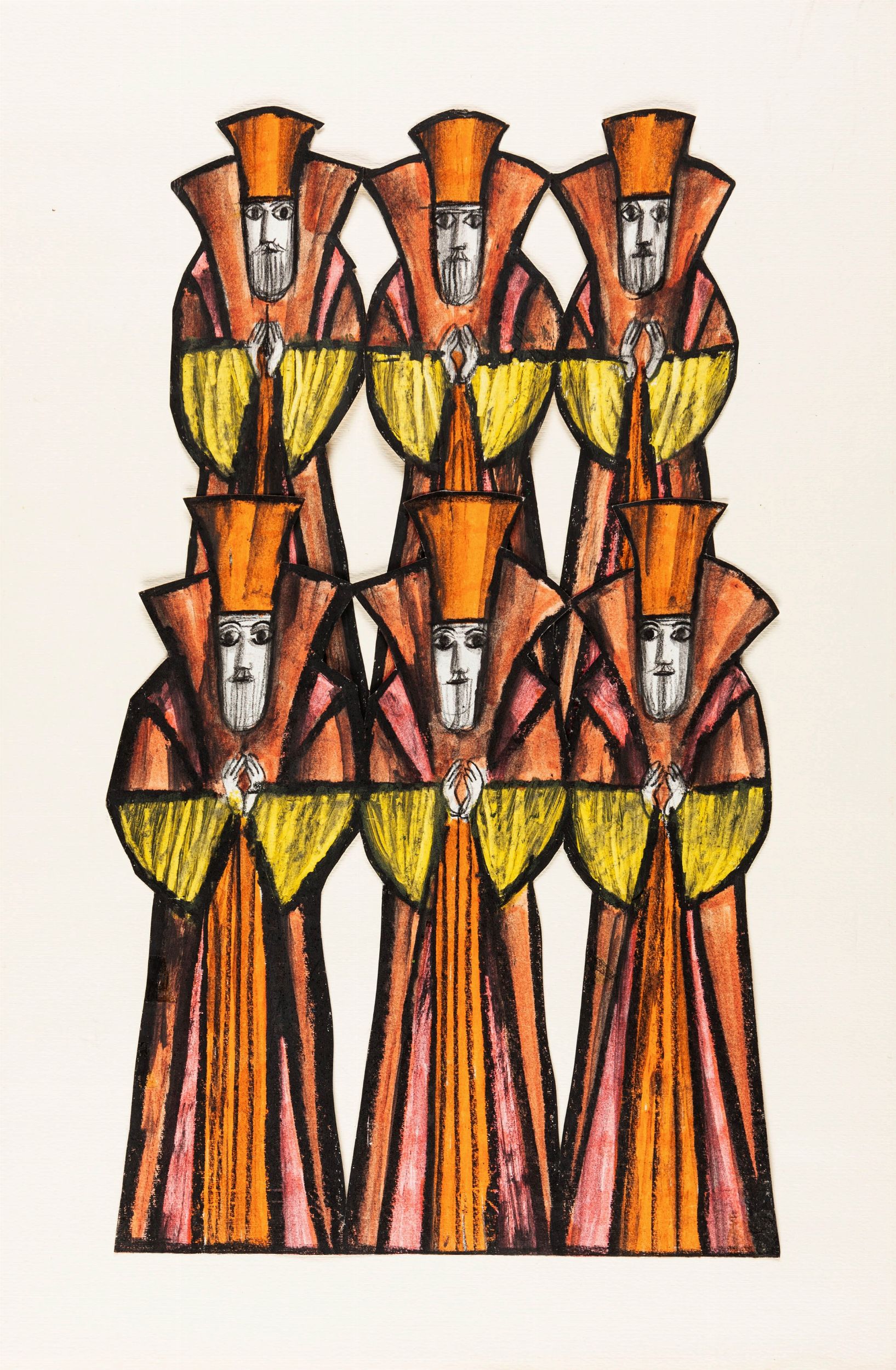 carboncino e pastelli a cera su cartoncino sagomato applicato su carta, 26,5 x 45 cm 1978 Disegno originale realizzato da Luzzati per il mediometraggio animato 'Il flauto magico', diretto da Giulio Gianini ed Emanuele Luzzati, basato sull'omonima opera del 1791 di Wolfgang Amadeus Mozart.