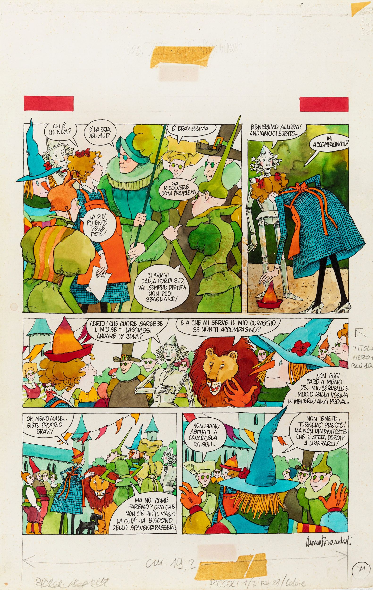matita, china e acquerello su cartoncino, 32 x 50 cm 1981 Tavola originale realizzata dalla Brandoli per la pag. 71 del suo celebre adattamento a fumetti de 'Il mago di Oz' di Franz Baum, edita per la prima volta sul C.d.P. n. 1 del 1981. Lieve piega all'angolo inferiore destro. Firmata.