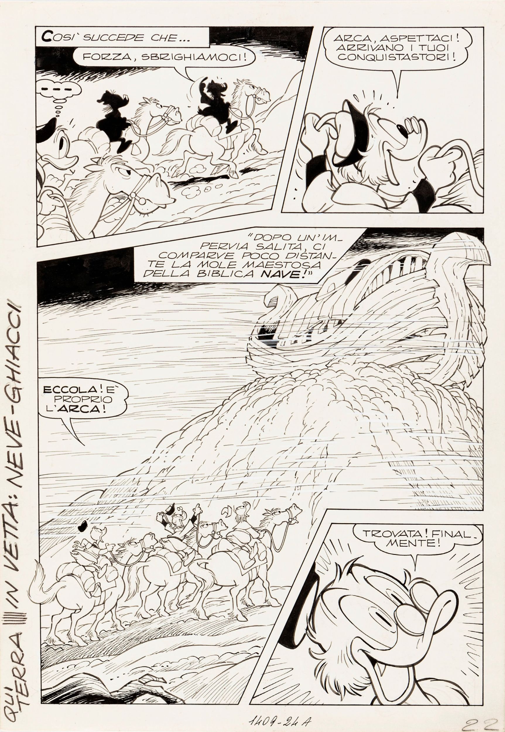 matita e china su cartoncino, 24,5 x 35 cm 1982 Tavola originale realizzata da Scarpa per 'La storia di Marco Polo detta Il Milione - L'arca trovata' edita su Topolino n. 1409 a pag. 22 nel novembre 1982. Primo capitolo di questa celebre parodia Disney uscita in quattro episodi sui numeri 1409 - 1412 di Topolino, trasposizione grafica delle vicende narrate da Rustichello da Pisa sotto dettatura di Marco Polo, una pagina di enorme impatto in cui Paperone e i suoi compagni trovano la famosa arca che da il nome a questa avventura. Di grande rarità.