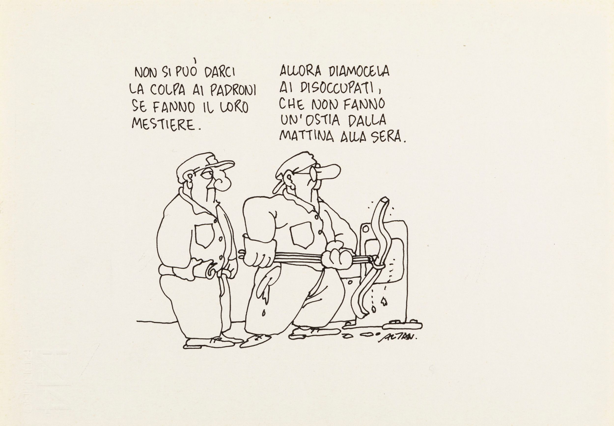anni 80 Illustrazione originale realizzata da Altan negli anni '80 per una delle sue celebri vignette satiriche raffiguranti il metalmeccanico comunista Cipputi. Firmata.