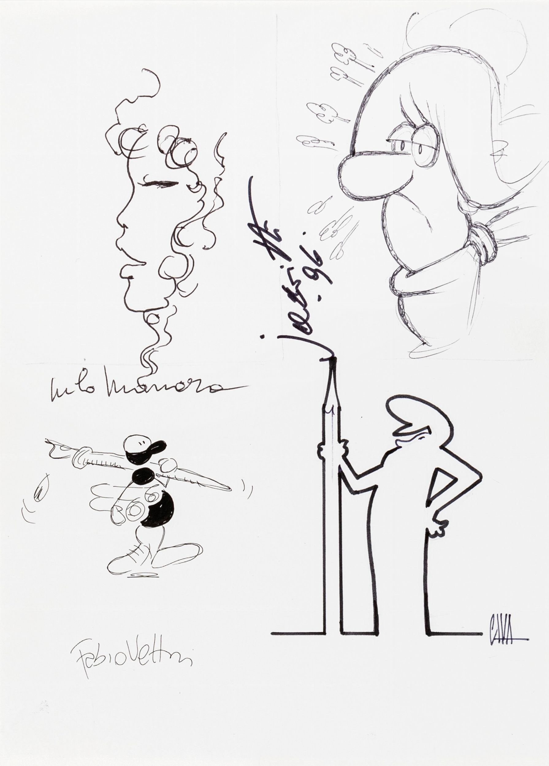 1996 Disegno realizzato a otto mani da Manara, Jacovitti, Cavandoli e Vettori. Firmato da ciascuno e datato.