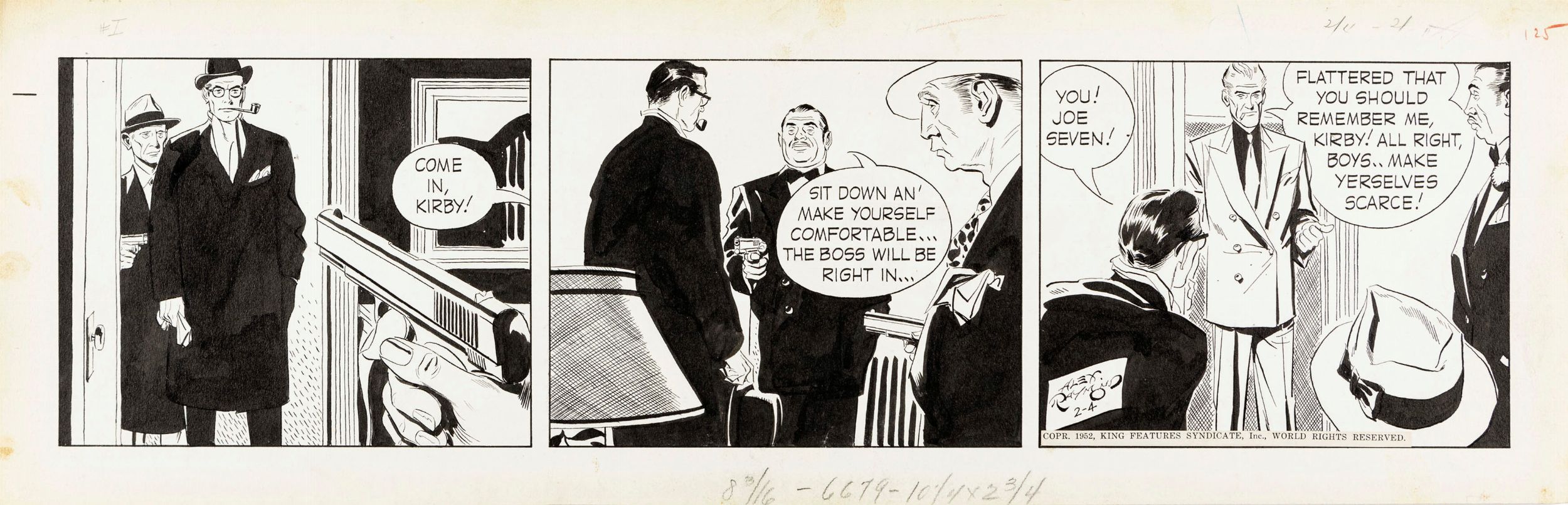matita e china su cartoncino, 55 x 18 cm 1952 Striscia giornaliera del 04/02/1952 per 'Rip Kirby'. Il personaggio di Rip Kirby è forse il più autobiografico tra quelli creati da Alex Raymond, infatti, come lui, è un ex marine diventato detective privato, come Raymond ama fumare la pipa ed è sempre molto elegante, raffinato e colto. Firmata e datata.