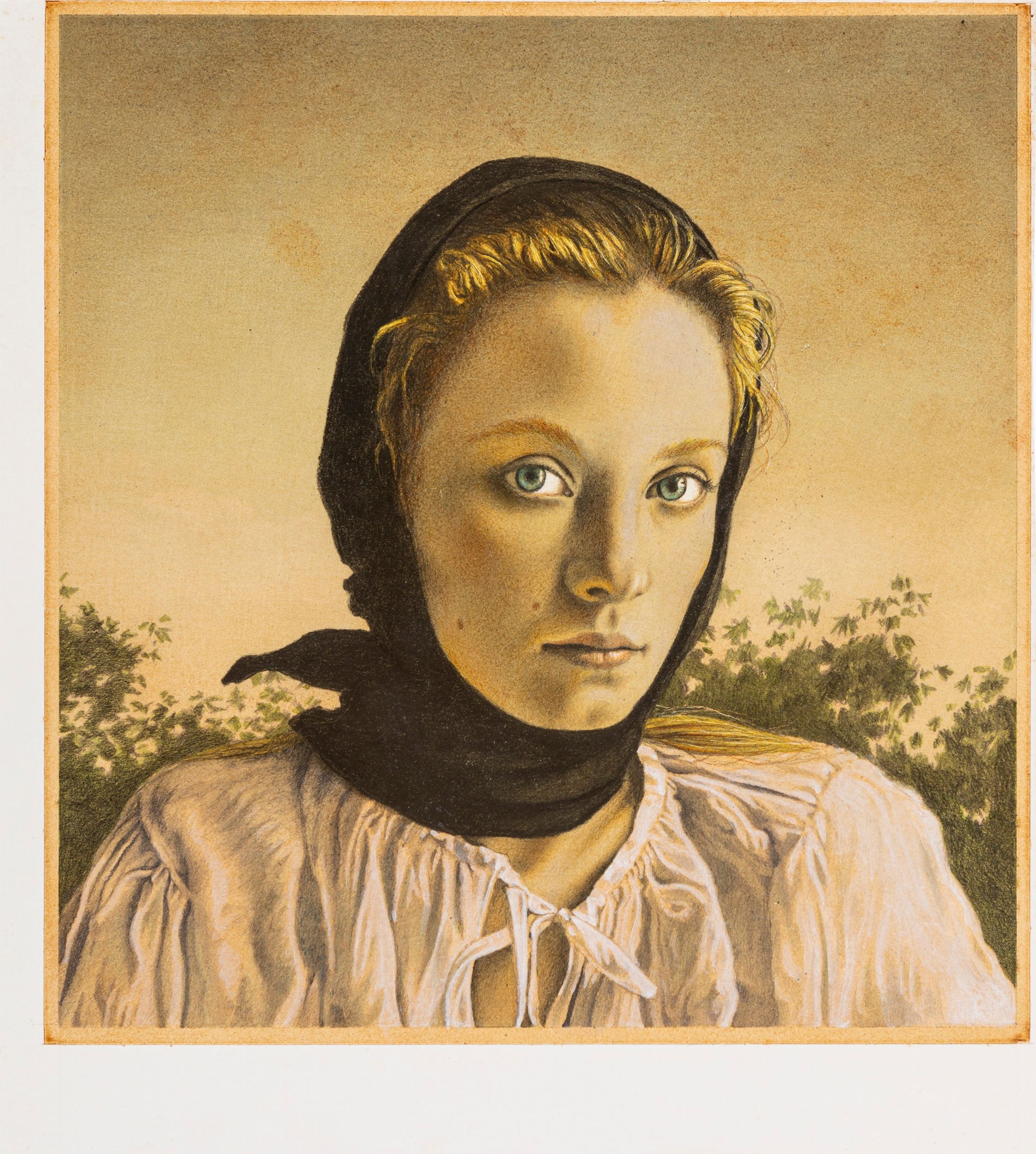 1991 Illustrazione originale realizzata da Ventura pubblicata sul libro 'Ritratto di una strega' da Mondadori nel 1991. « I ritratti che compongono questo libro non sono quelli di un‘orrida vecchia e neppure quelli di una dark lady dalla bellezza inquietante, sono i ritratti di una ragazza qualsiasi, d‘una adolescente contadina dalla bellezza acerba e innocente, colta nelle umili e banali occupazioni della sua vita quotidiana. Cosa ha a che fare con le streghe, cosi come siamo abituati ad immaginarle? Con i ritratti di Caterina Farcigli Piero Ventura intende rispondere a questa domanda, mostrando visivamente quello che gli studiosi, da molto tempo ormai, hanno ricavato dai documenti e dai verbali dei processi per stregoneria, ma che la mentalità comune stenta ancora ad accettare. »
