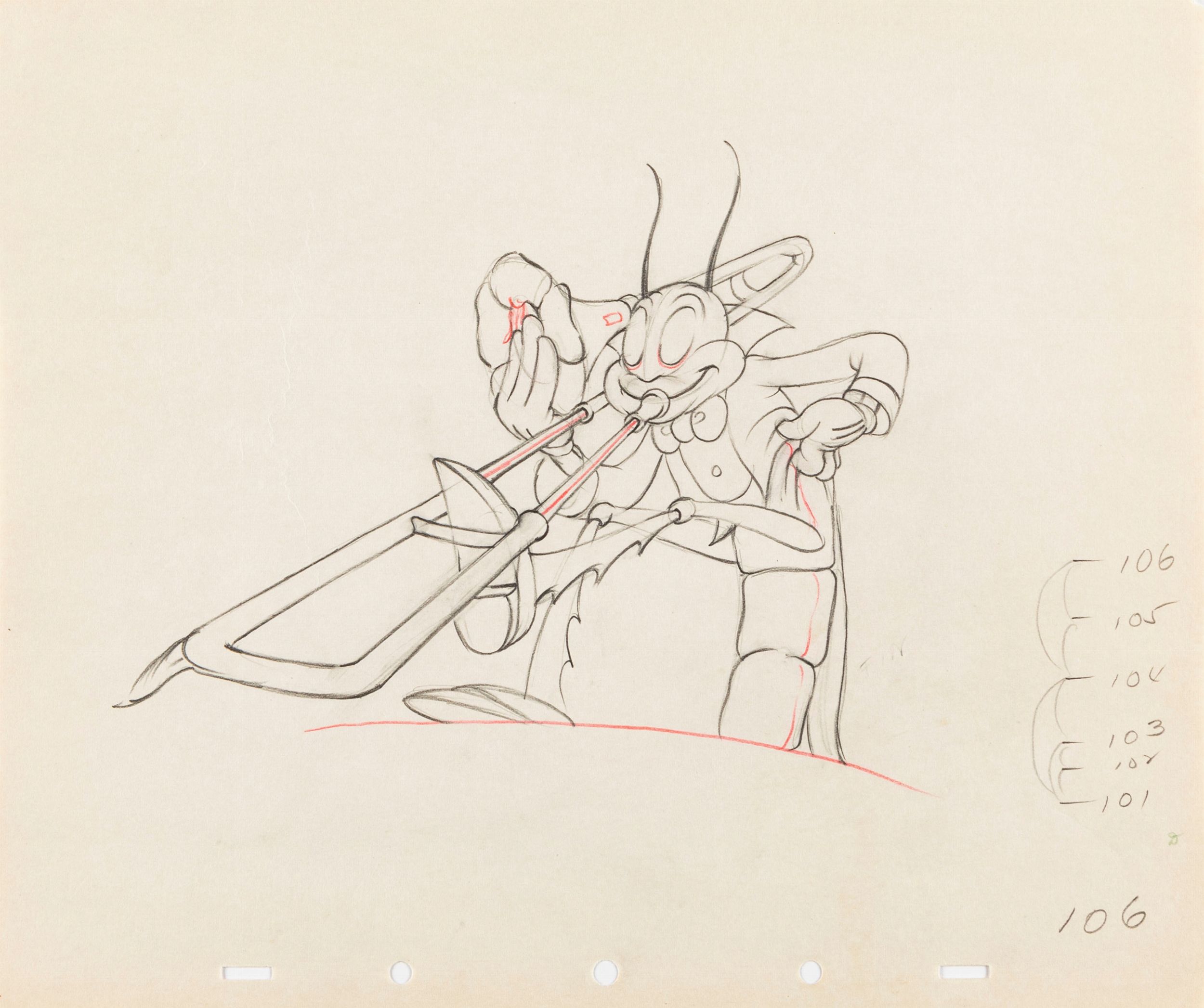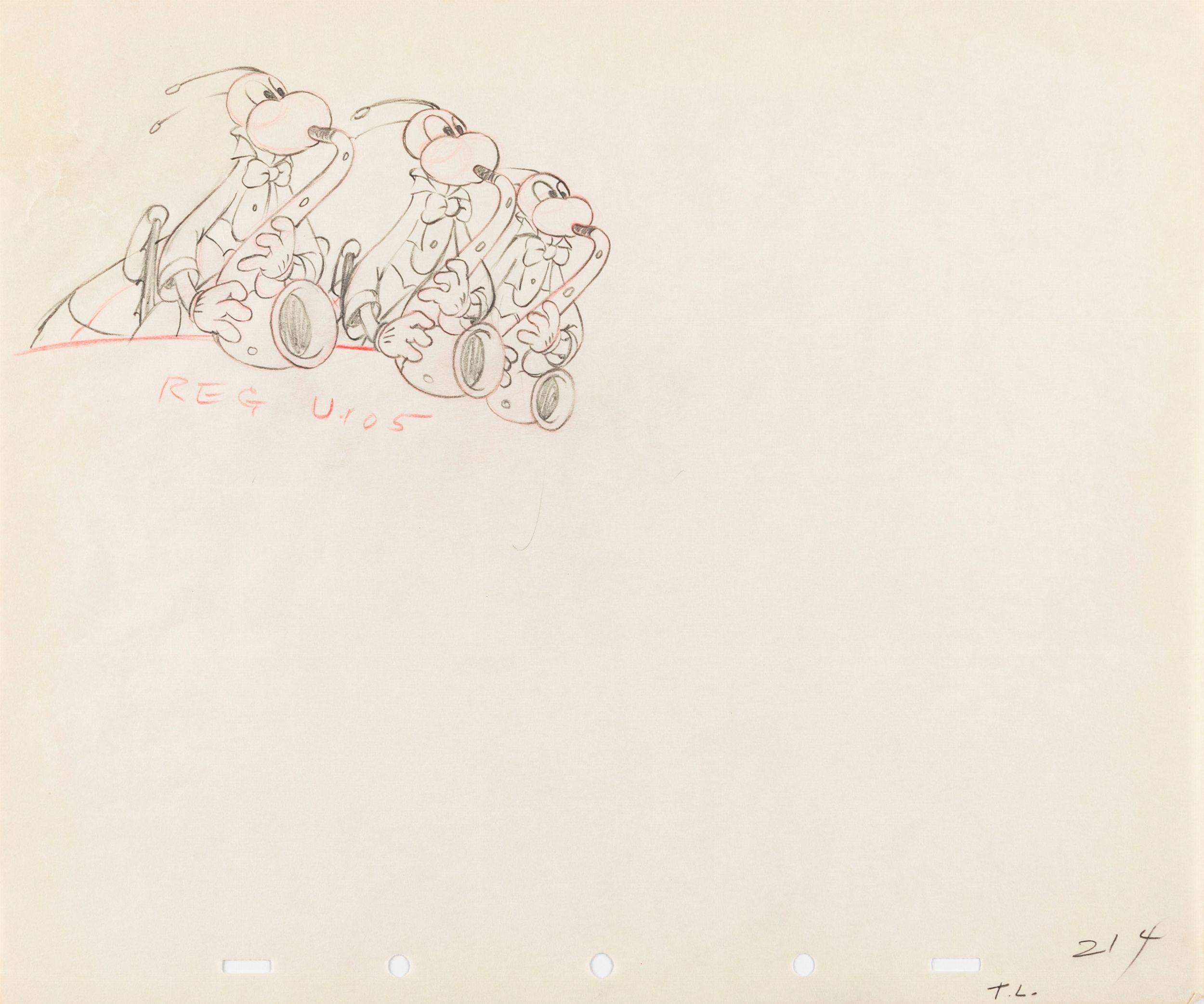 matita e pastelli su carta, 30,5 x 25,5 cm ciascuno 1937 Lotto composto da 3 disegni di produzione realizzati dallo Studio Disney per il cortometraggio animato 'Woodland Café', appartenente alla celebre serie delle Silly Symphony, diretto da Wilfred Jackson e prodotto dalla Walt Disney Productions nel 1937.