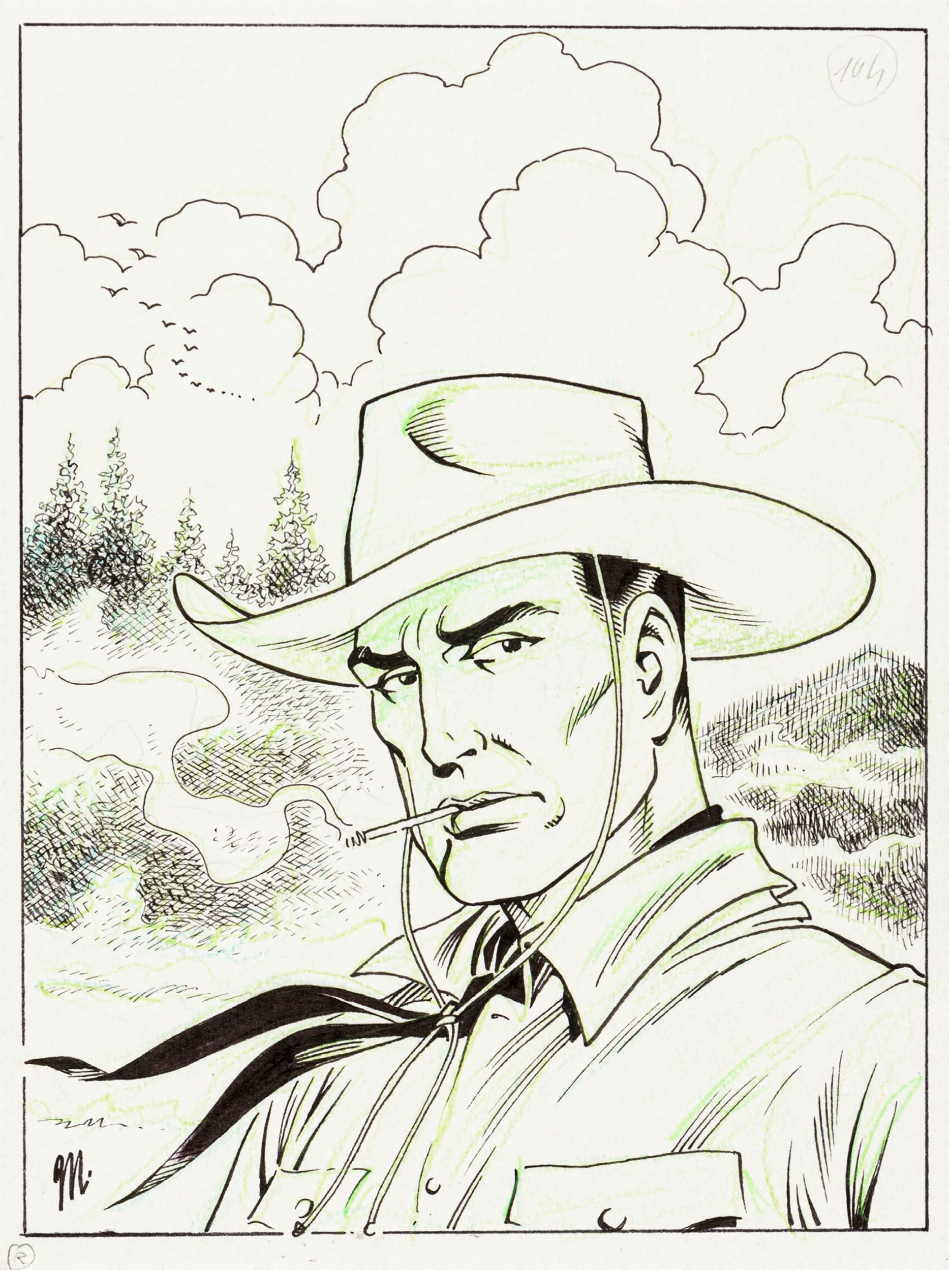 pastello e china su cartoncino, 18 x 24 cm anni 90 Studio originale realizzato da Magnus per il suo Texone 'La valle del terrore' edito dalla Bonelli nel 1996. Opera pubblicata sul volume 'Al servizio dell'eroe: il Tex di Magnus' a pag. 37 dall'Editrice Punto Zero nel 1996. Firmato.