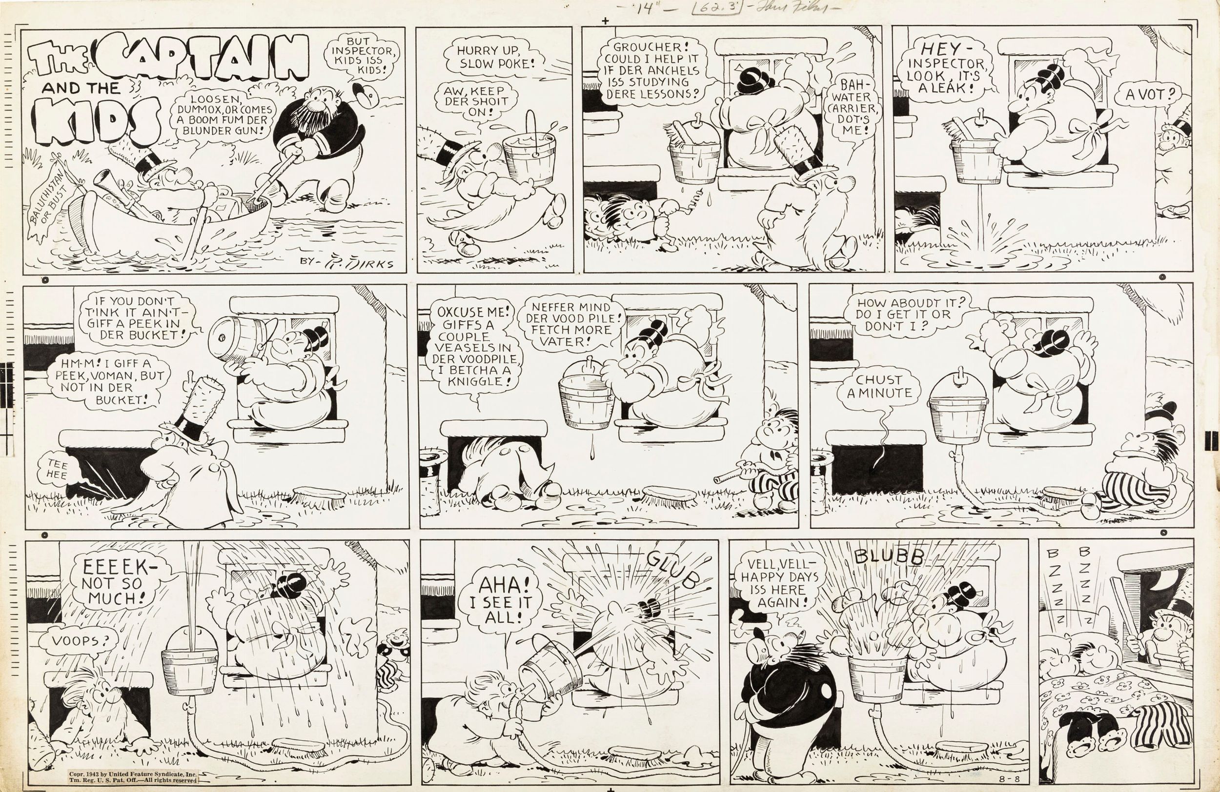 matita e china su cartoncino, a) 60 x 39 cm b) 58,5 x 40 cm 1943 Tavola domenicale del 08/08/1943 per 'The Captain and the Kids'. Considerata la prima comic strip nella storia del fumetto americano a fare uso dei balloon; la striscia è nota in Italia soprattutto per essere stata pubblicata con grande successo, a partire dal 1912, su Il CdP come Bibì e Bibò e Capitan Cocoricò. Firmata e datata. Nella parte inferiore è presente 'Hawkshaw the Detective' di Gus Mager. Piccolo strappo al margine inferiore e lievi pieghe ai margini. Firmata e datata.