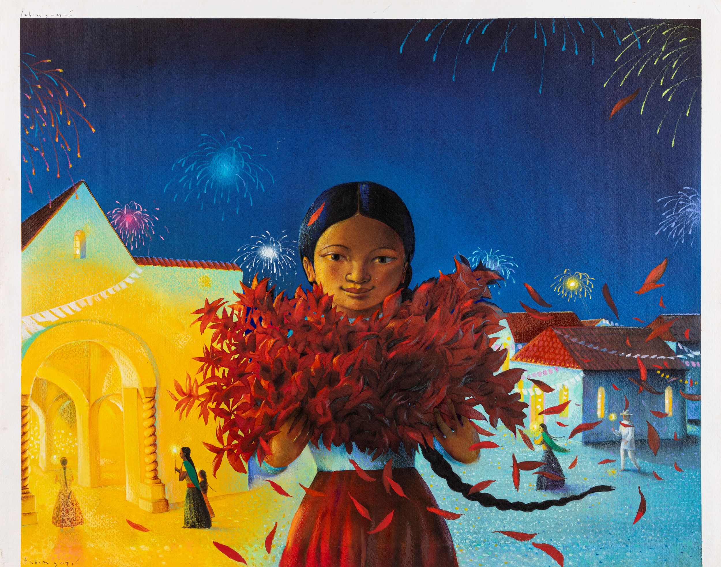 tempera su cartoncino, 63 x 50 cm 2003 Originale di copertina realizzato da Negrin per 'The Miracle of the First Poinsettia: A Mexican Christmas Story' di Joanne Oppenheim, edito per la prima volta in Inghilterra da Barefoot Books nel 2003. Opera pubblicata sul catalogo della mostra 'L‘illustrazione racconta: la collezione Cereda' a pag. 50, edito dalla Fondazione Peano nel 2022. Firmato.